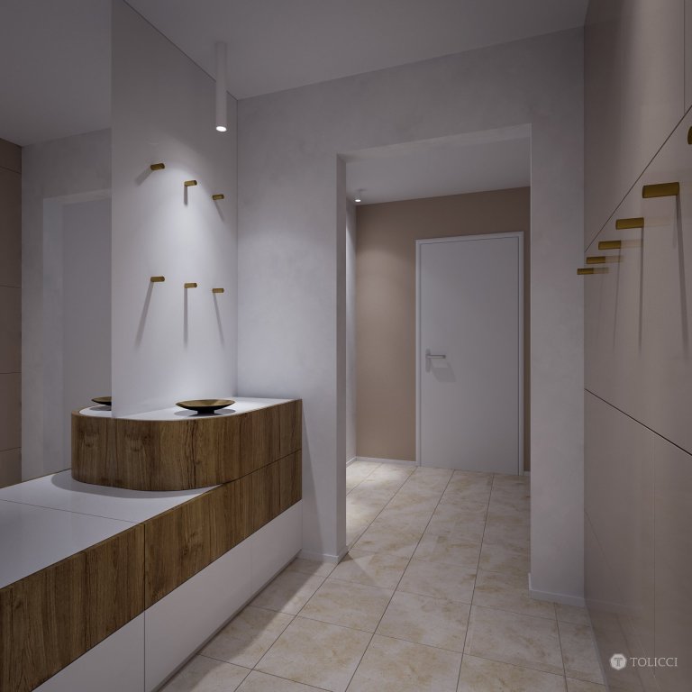 Cieľom návrhu rekonštrukcie bytu bolo vytvoriť prirodzený, jednoduchý a elegantný dizajn. Základ interiéru tvoria jednoduché línie doplnené o príjemné farebné tóny pomocou drevených obkladov a farebných odtieňov použitých v návrhu, v identite tvorby interiérov TOLICCI.