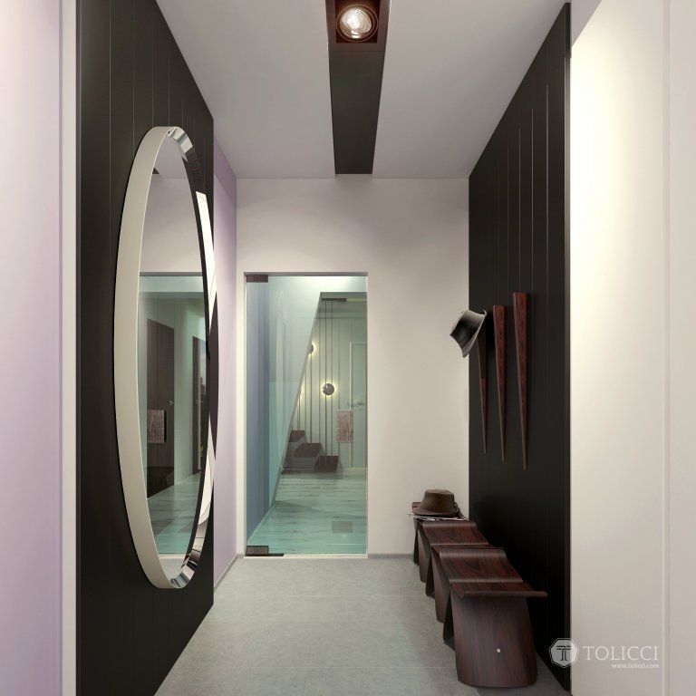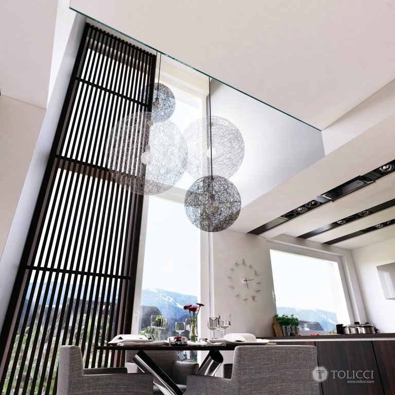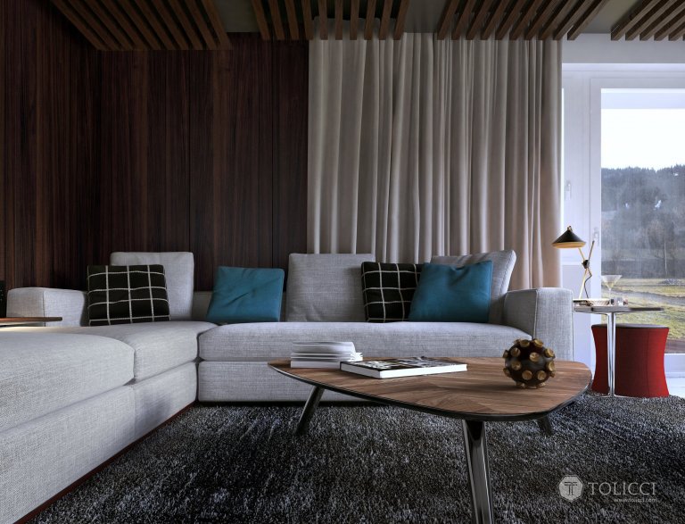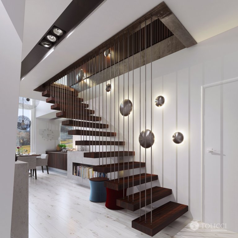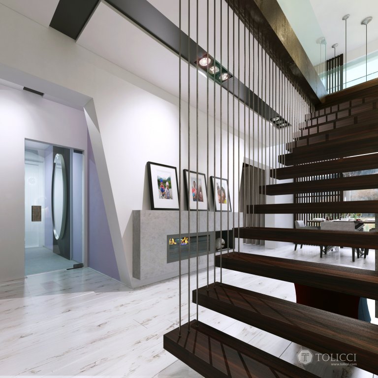 Ide o náš prvý projekt, v ktorom sme aplikovali princípy tradičného talianskeho prístupu k interiéru. Kontrasty tvoria tmavé orechové drevo s bielymi plochami stien a podláh. Interiér je navrhnutý ako jednoduchý čistý a funkčný priestor pre mladú rodinu s jedinečnými dizajnérskymi kúskami v podobe zariaďovacích prvkov. Otvorenú galériu sme doplnili o vzdušné guľovité svietidlá, ktoré priestoru dodali ľahkosť a podporili výšku priestoru jedálne. Perspektívu schodiska sme podporili skosenými stenami, ktoré priestor ozvláštnili a prepojenie chodby sme odľahčili zaveseným vzdušným schodiskom v identite tvorby interiérov TOLICCI.
