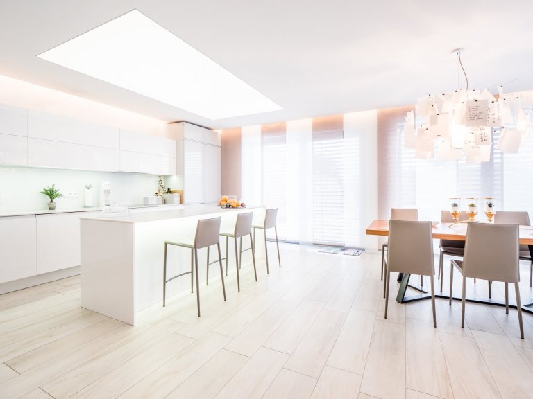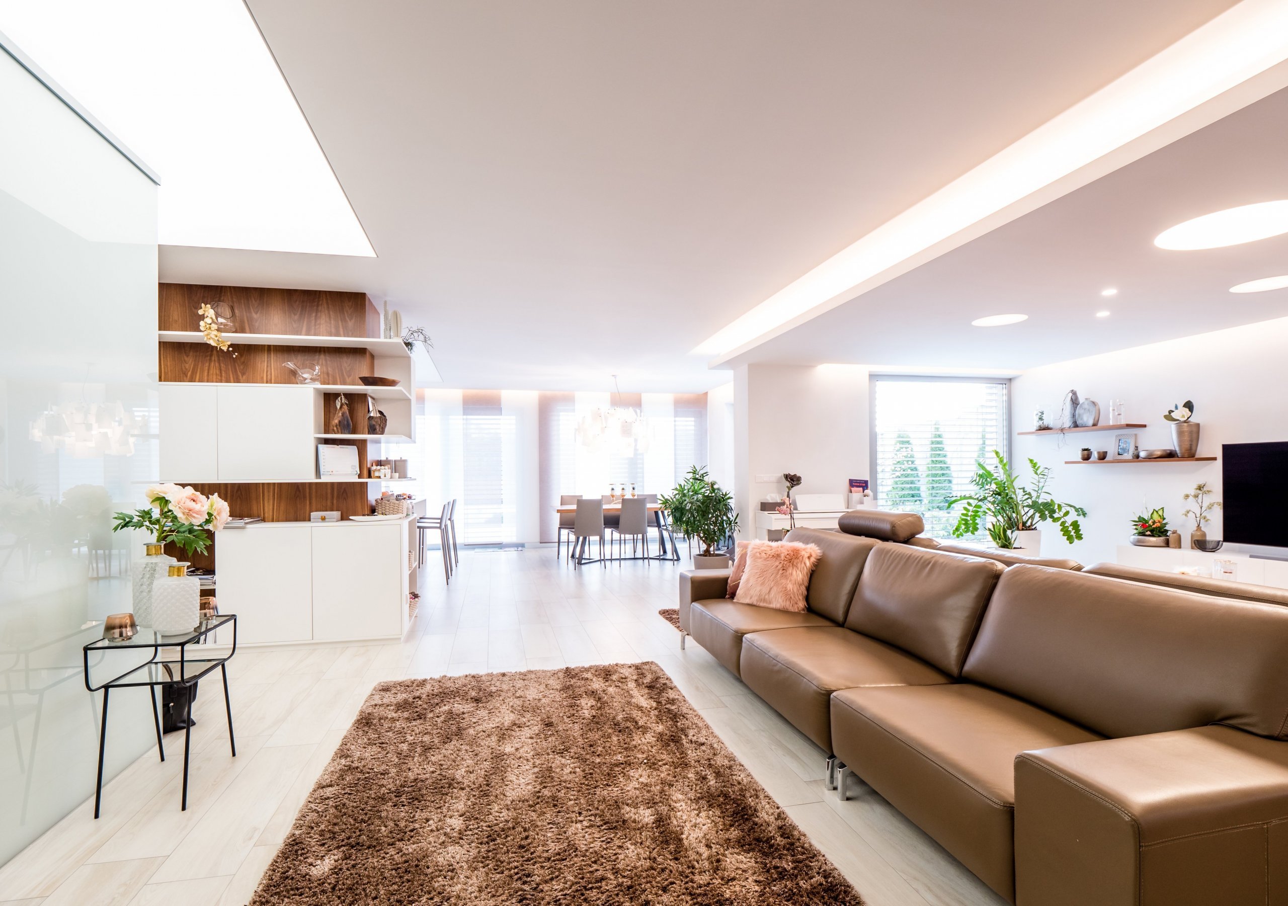 Velký důraz byl kladem na nasvětlení prostoru – jsou použity bodová svítidla, nasvětlovací rampy, výrazné svítidlo nad jídelním stolem a v neposlední řadě podsvětlené pnuté folie nad kuchyňským ostrůvkem a u pracovního koutu. Obyvatelé rodinného domu si tak můžou vytvořit světelnou atmosféru dle nálady a podle typu činnosti, které se budou v obývacím pokoji věnovat.