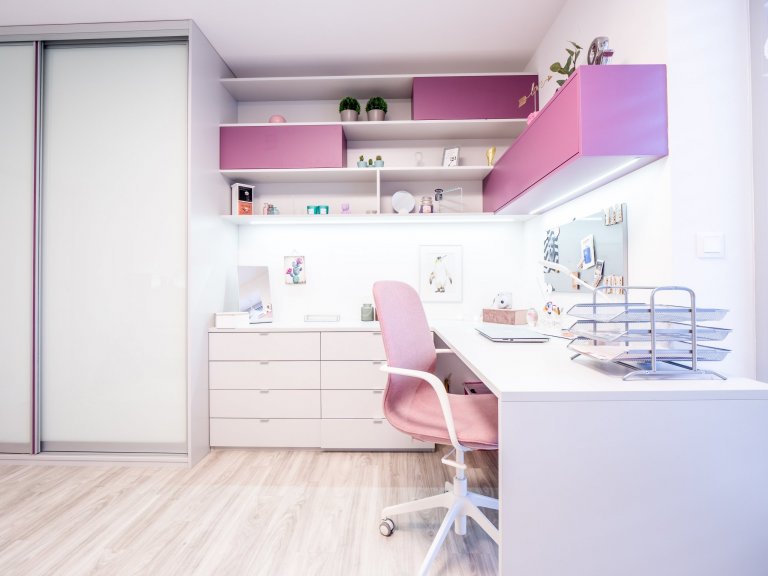 Stejný barevný a materiálový koncept prochází i zbytkem domu, díky čemuž působí design celého domu jednotně. Jediné dětské pokoje mají základní bílou barvu doplněnou každý o svoji vlastní barevnost- růžovou pro holčičku a zelenou pro chlapce.