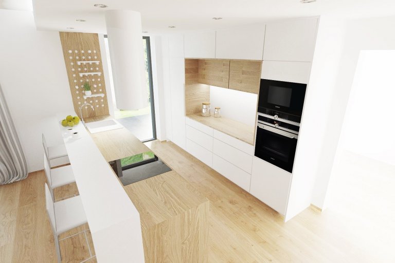 Interier obývacího pokoje v Rd Brusné vychází z barevnosti dubového dřeva, ke kterému je nakombinována šedá a bílá barva. Budoucí majitelé si mohou interier doplnit jakoukoliv doplňkovou barvou a bude vždy vypadat nově. Vše je vzájemně sladěno... například tvar světla nad jídelním stolem se odráží do židle v pracovním koutu.