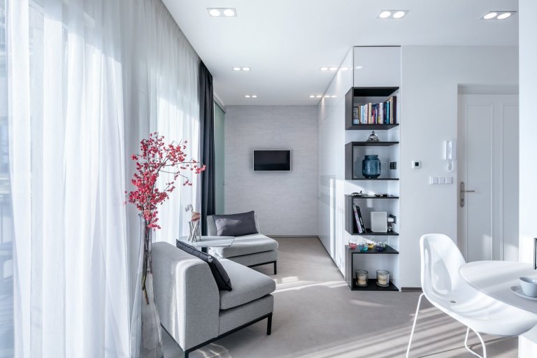 Původně jako investiční byt na krátkodobý pronájem, časem změněno díky zásadní změně v klientově životě na jeho kancelář "koučovací ateliér". Vytvořil se návrh interiéru a od developera se převzal byt v kolaudačním minimu, tj. pouze obvodové zdi. Takto jsme mohli reflektovat veškeré požadavky na funkčnost a vytvořit interiér, který bude plně vyhovovat potřebám klienta. Člověk míní a osud mění......