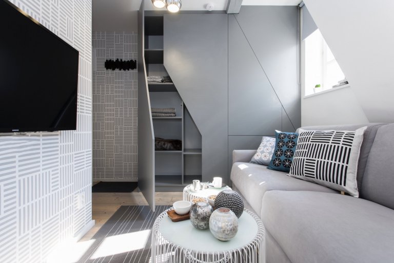 Investiční malometrážní byt pro účely krátkodobého pronájmu pro starší manželský pár v penzi. Pouhých 13 metrů čtverečních a navíc ještě se šikminami a trámy byla výzva! Jak zajistit přespání pro 2 osoby, úložné prostory a možnost jednoduchého občerstvení z kuchyňky? Vše klaplo, manželé byt úspěšně pronajímají a generují extra příjem k penzi.