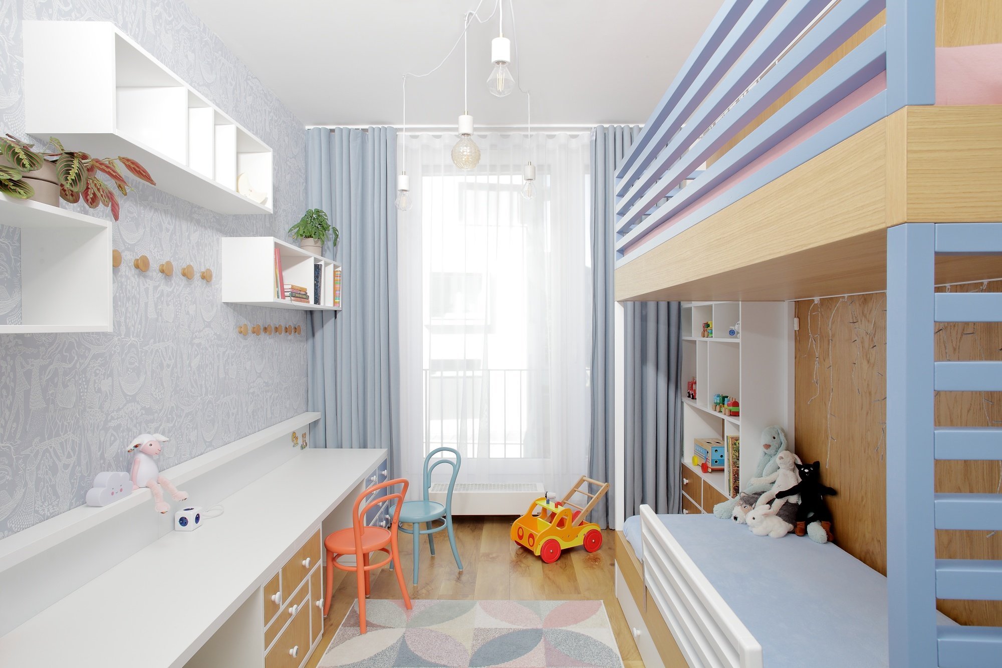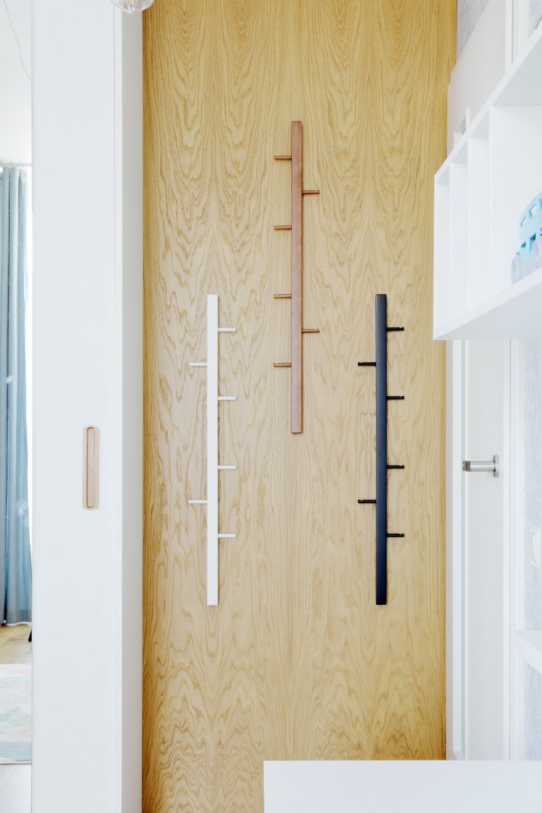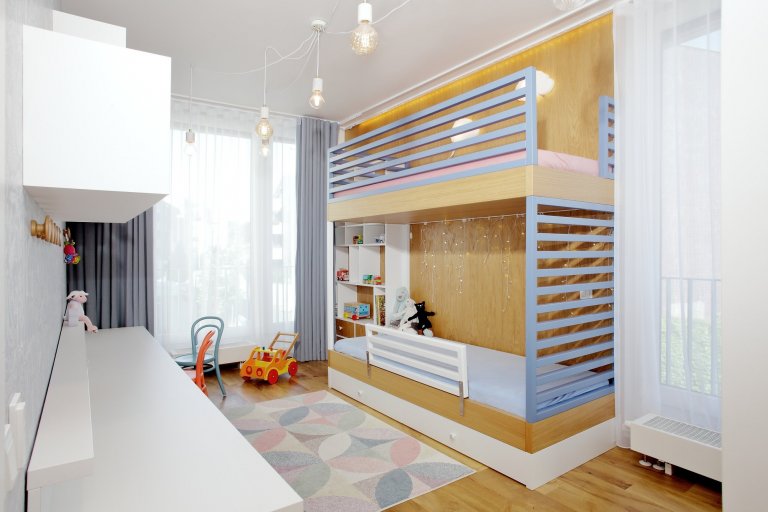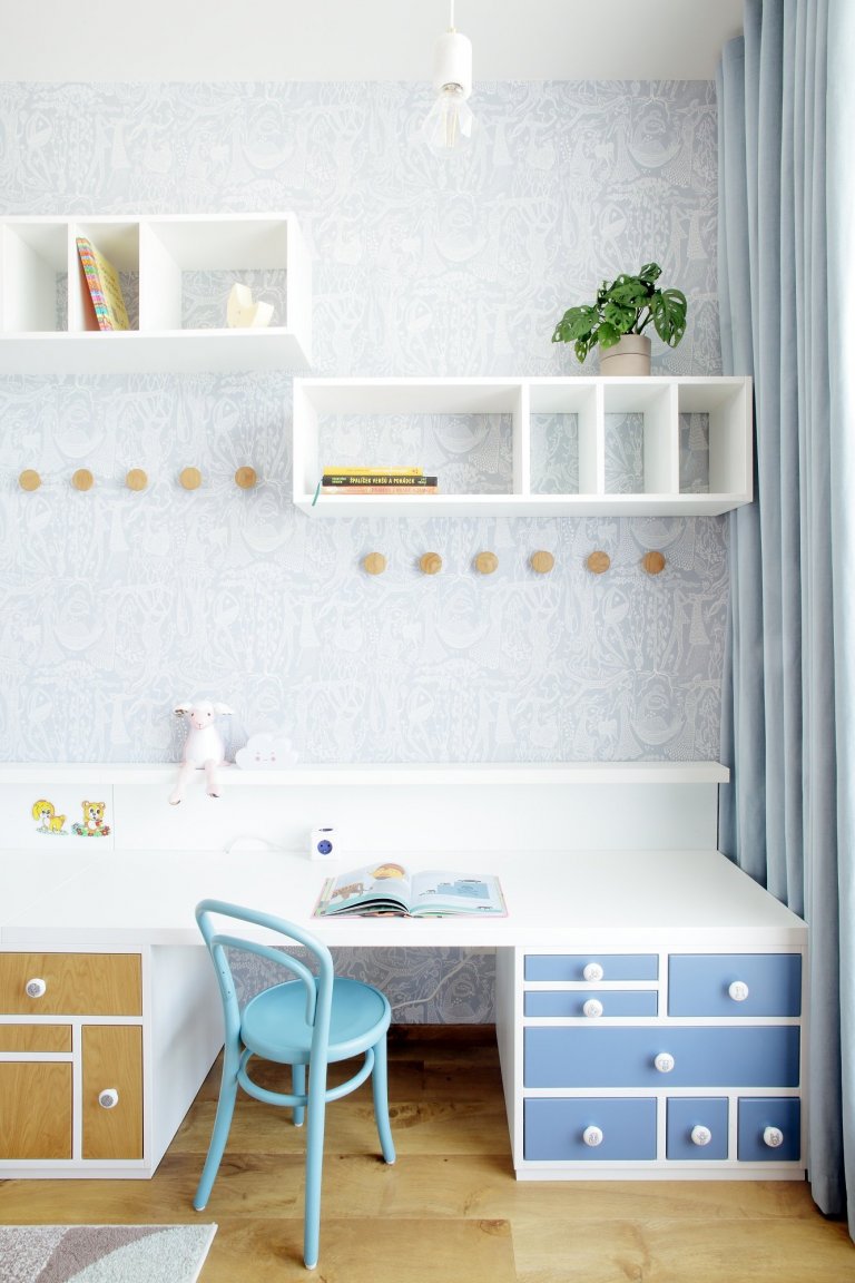 Představujeme vám parádní dětský pokoj se zábavnou sadou asymetrických šuplíků! V této úzké místnosti jedné straně vládne poschoďová postel s pastelovými žebřinami a druhé prostorná pracovní plocha podložená zásuvkami s kulatými úchyty. Bílá a modrá barva lamina se zde střídá s přírodní texturou dubového dřeva, což dodává prostoru lehkou a útulnou atmosféru. Najdete tu také řadu věšáků, ať už nad stolem nebo v koutku u šatní skříně. To proto, že omezený prostor lze mnohem lépe využít, když se vám hračky a oblečení nepletou pod nohama.
