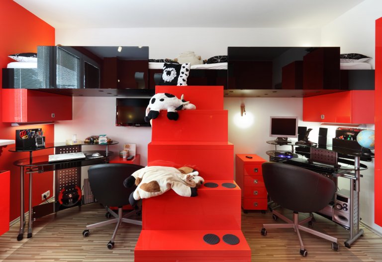 Dominantou pokoje je pak parádní poschoďová postel, do které vedou opravdu impozantní schody. Ani ty tu ale nejsou jen tak pro zábavu. Najdete pod nimi totiž spoustu volného prostoru pro úschovu všeho, co takové starší dítě může v životě potřebovat. A nakonec jsou tu černočerné zábrany, která poskytují soukromí i nějaké to zabezpečení během spánku.