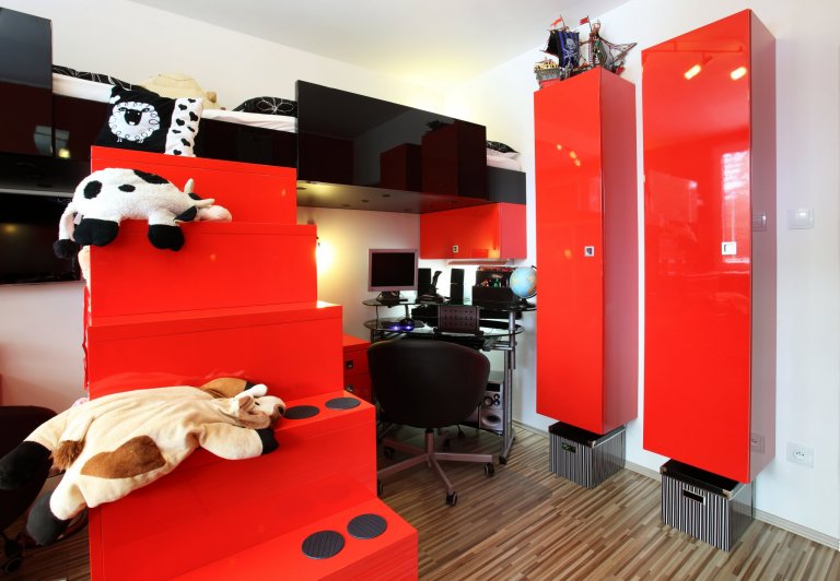 Všichni víme, že teenageři mají často pořádný smysl pro drama. A ve vlastním pokoji by měli mít možnost vyjádřit svůj styl také navenek! I proto tady mají hlavní roli černá a ostře červená – jsou to barvy, které v člověku doslova rozproudí krev! Lakované šatní skříně jsou vyrobeny ve stylu klasických školních skříněk a zavěšeny na stěně v pravidelných rozestupech. To nechává celou místnost dýchat, protože žádný úsek není zastavěný nábytkem. V podobném designu jsou vyvedeny i pracovní stoly a šuplíky. Ty jsme tvořili na míru tak, aby krásně zapadly třeba pod parapet nebo do výklenku pod postelí.