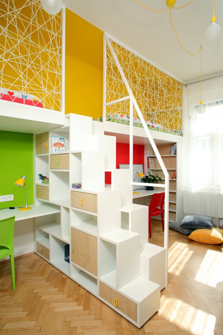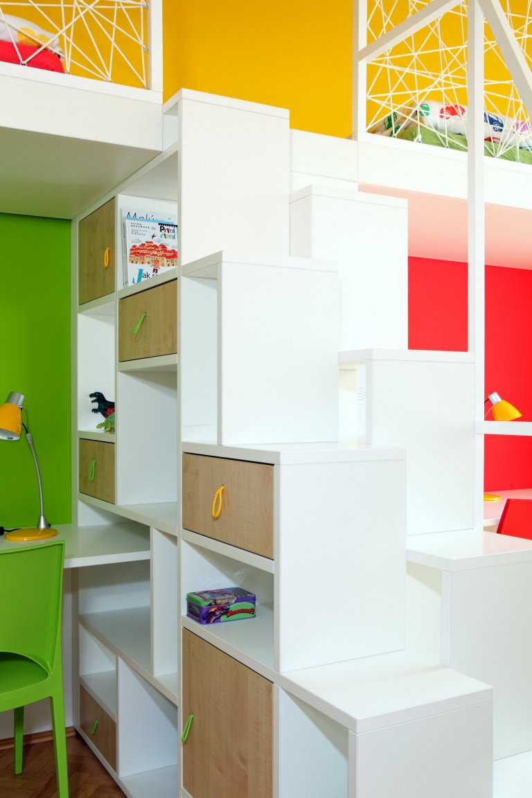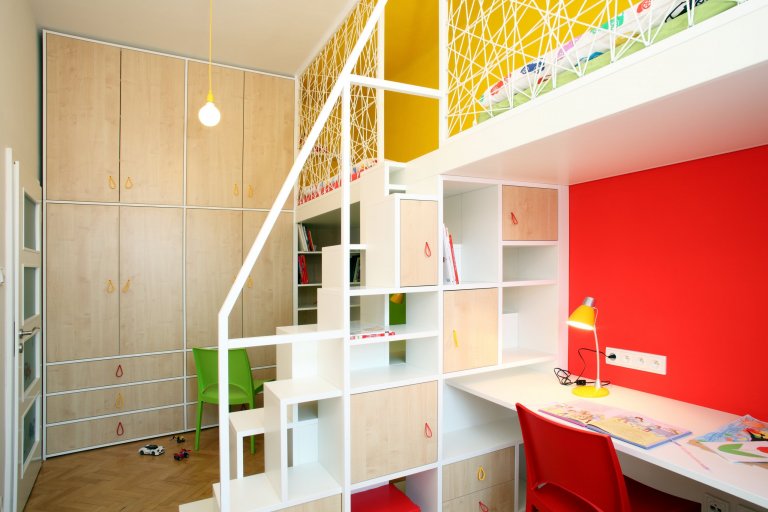 Tak tady máme pokojík pro opravdové dobrodruhy! Aby se do menšího prostoru komfortně vešly dvě postýlky i dostatečný pracovní prostor, vyrobili jsme na spaní vyvýšenou plošinu! Na tu se děti dostanou pomocí šikovných schůdků, které jsou rovnou napojeny na psací stoly a postranní knihovničky. A aby toho nebylo málo, slouží výplň schodů i jako praktické místo pro šuplíky a regály!