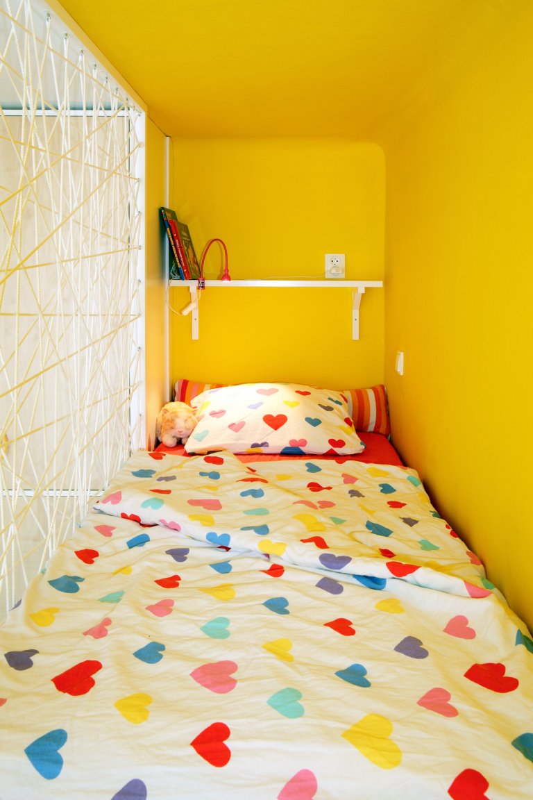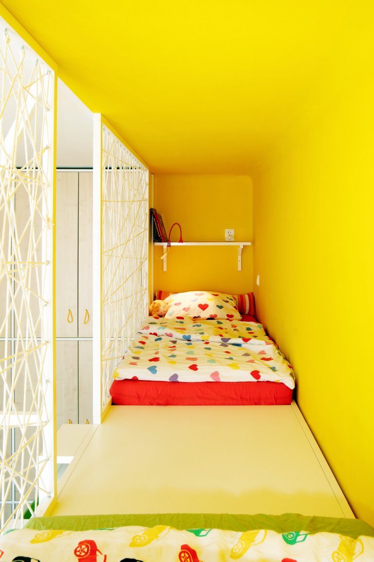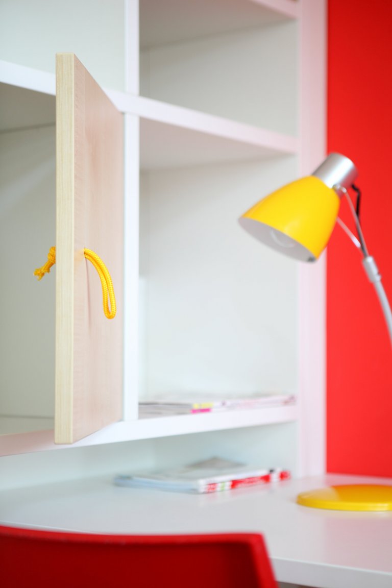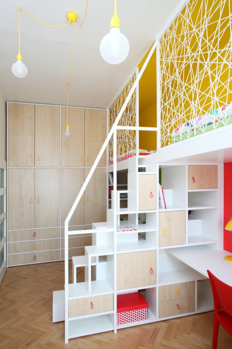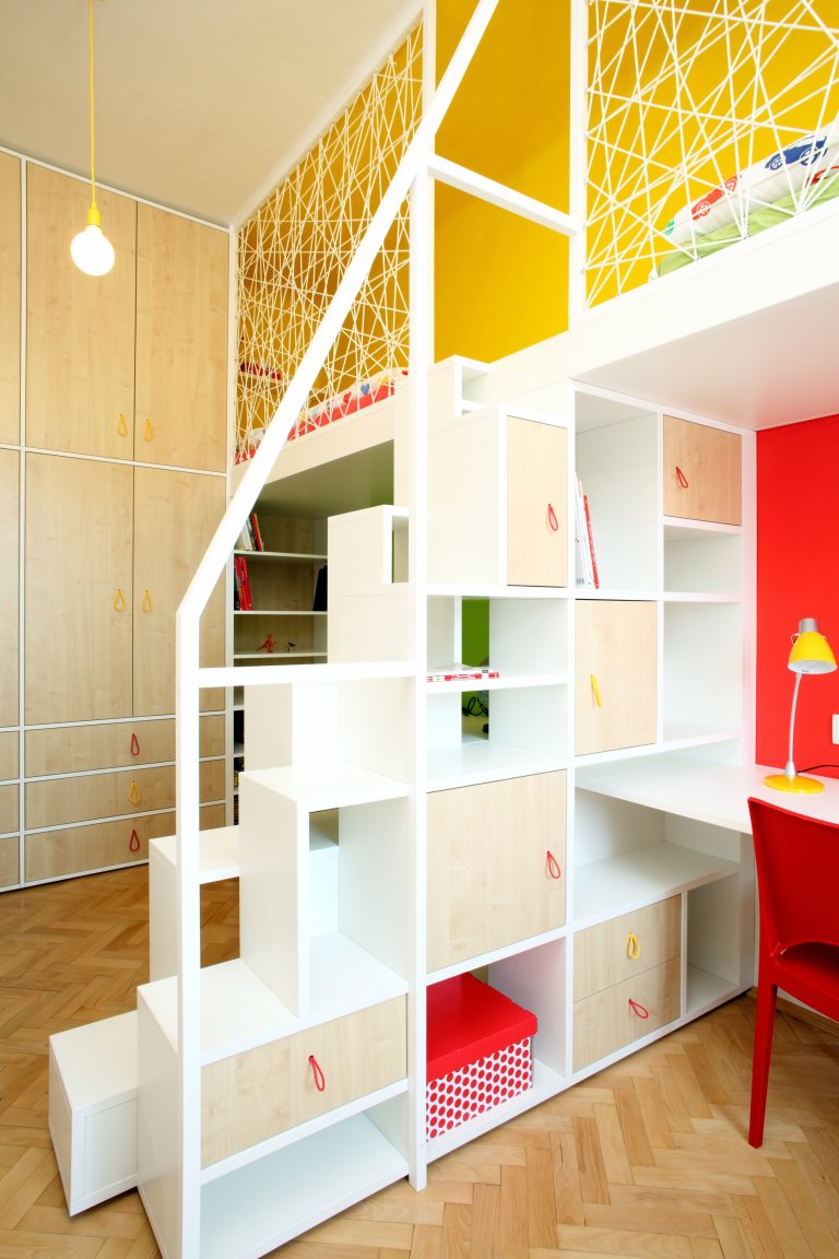 Většina korpusu je vyrobena z bílého lamina, zástěny a dvířka úložných prostor pak mají barvu přírodního dřeva. Šatní skříň je zasazena těsně u stěny, aby nebránila v průchodu do místnosti. Její dvířka mají místo klasických úchytek barevná lanka, která jsou u dětí oblíbeným prvkem. Další lana najdeme také ve výpletu stropního prostoru, kde malým raubířům zajišťují bezpečný spánek. Tento pokoj je zkrátka parádní příklad toho, že s trochou představivosti lze i omezené prostory hravě a efektivně využít.