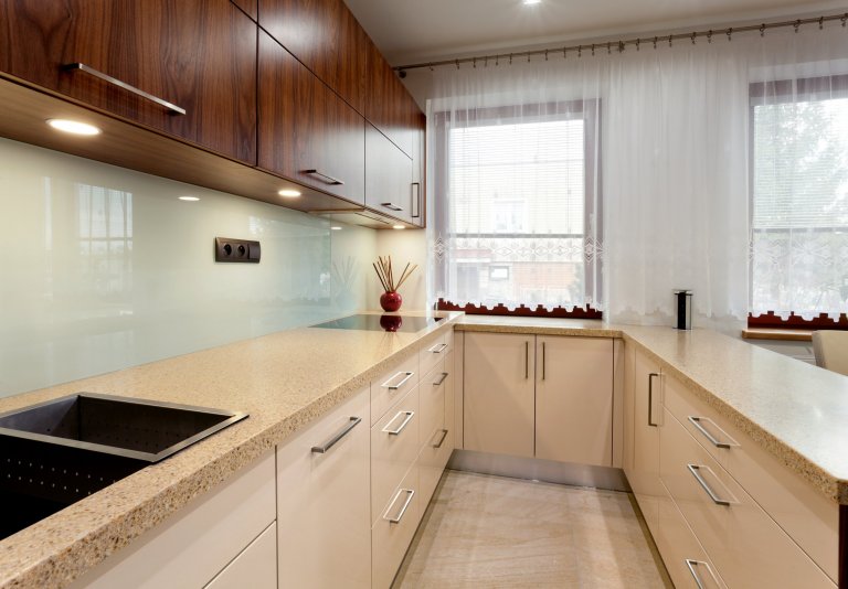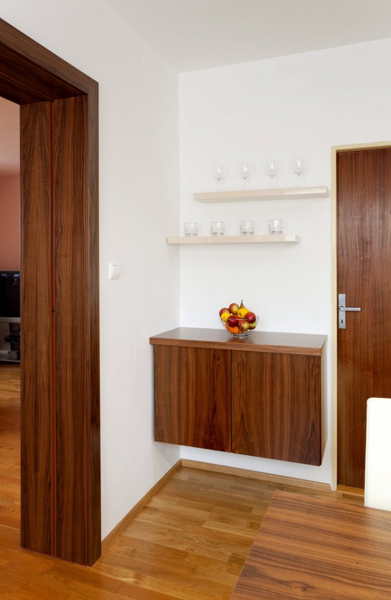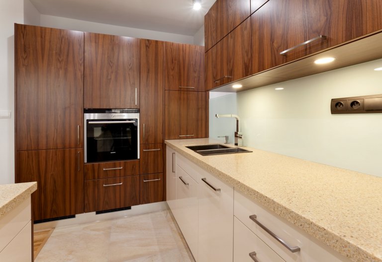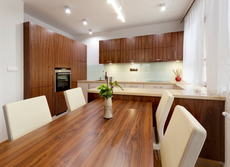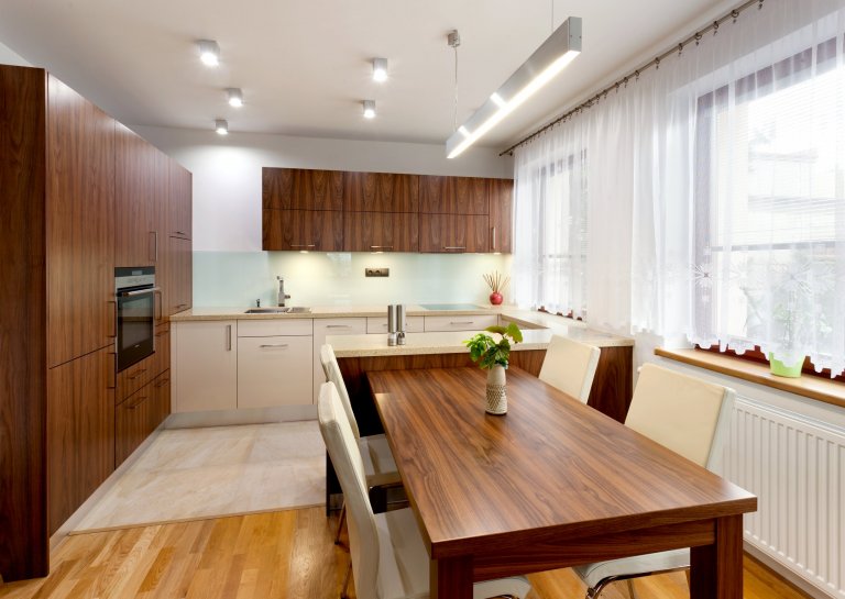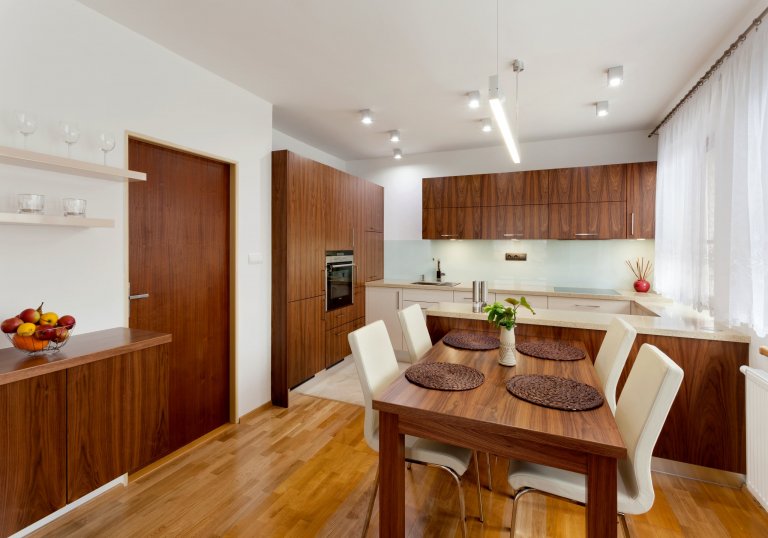 Prostorná kuchyň s jídelnou laděná do kávových a čokoládových tónů – tady by se chtělo mlsat opravdu každému! Hlavní roli jednoznačně hraje americký ořech, který tvoří velkou část úložných prostor a svou unikátní texturou na sebe ihned upoutá pozornost. V jemnějších tónech jej doplňuje kuchyňská deska z umělého kamene Staron, stejně tak jako laminované skříňky a šuplíky pod ní. Nesmíme zapomenout ani na jídelní židle Nautilus z umělé kůže – ty jsou elegance sama!