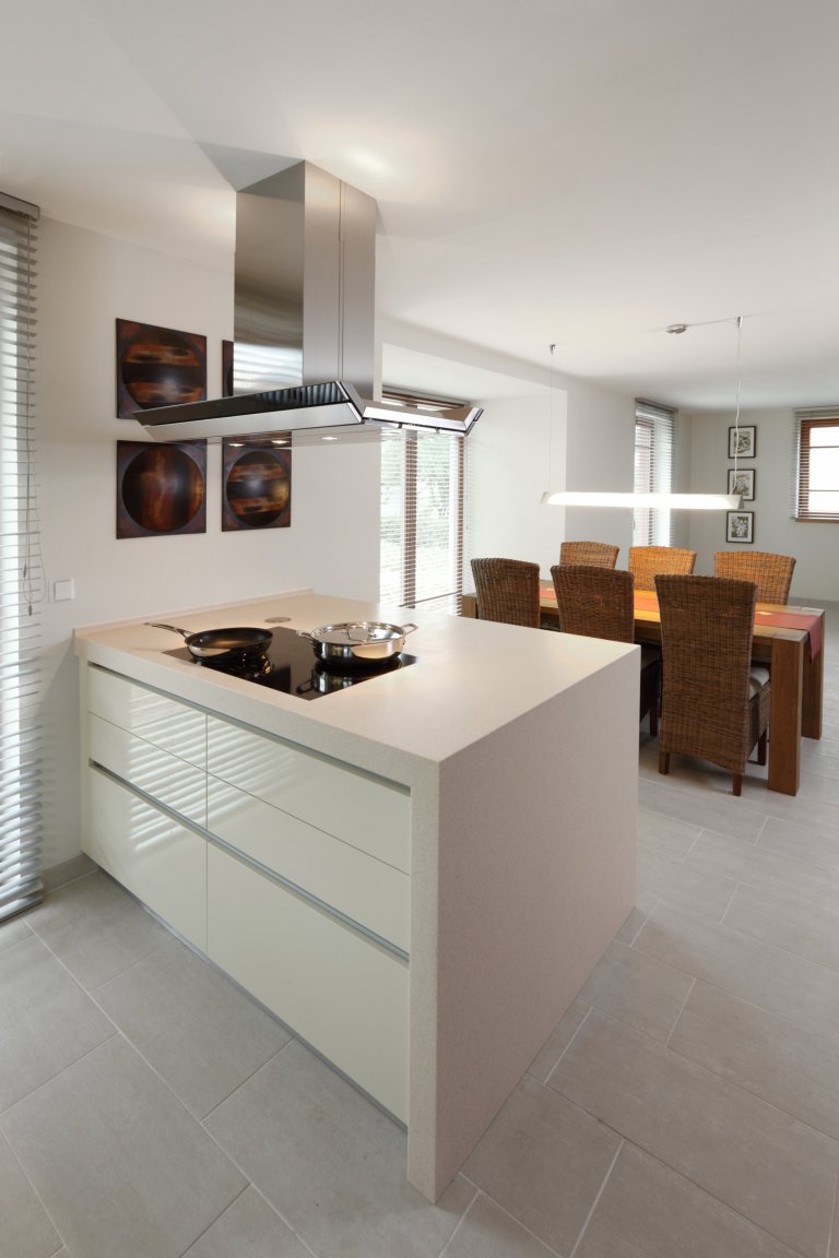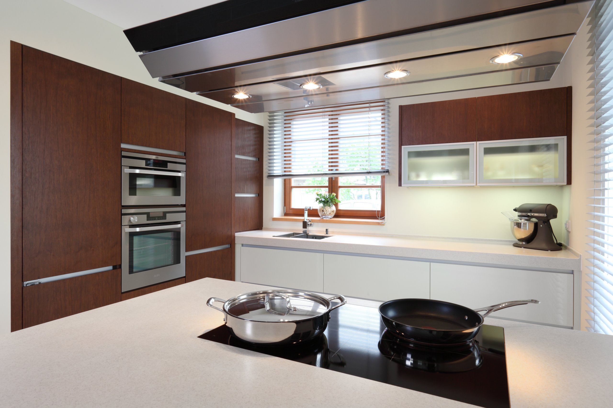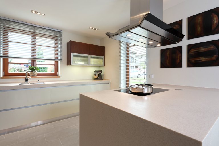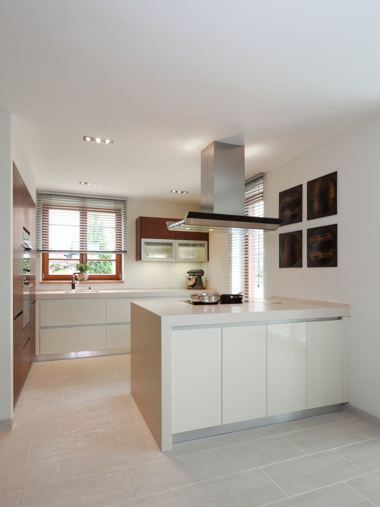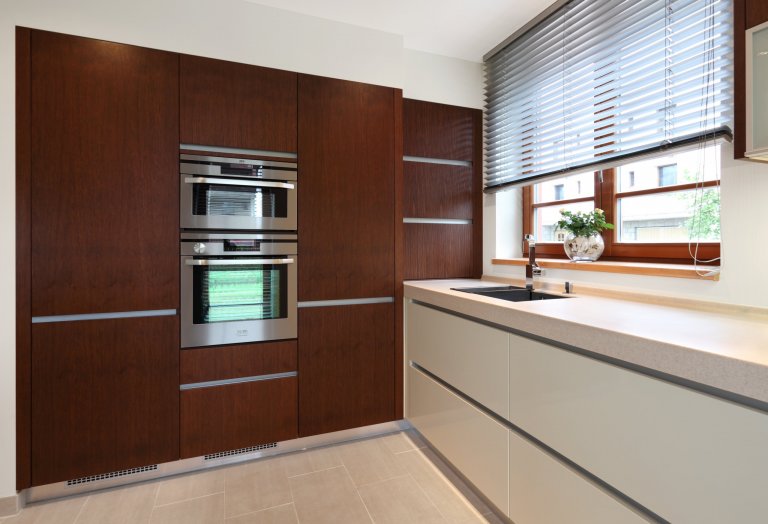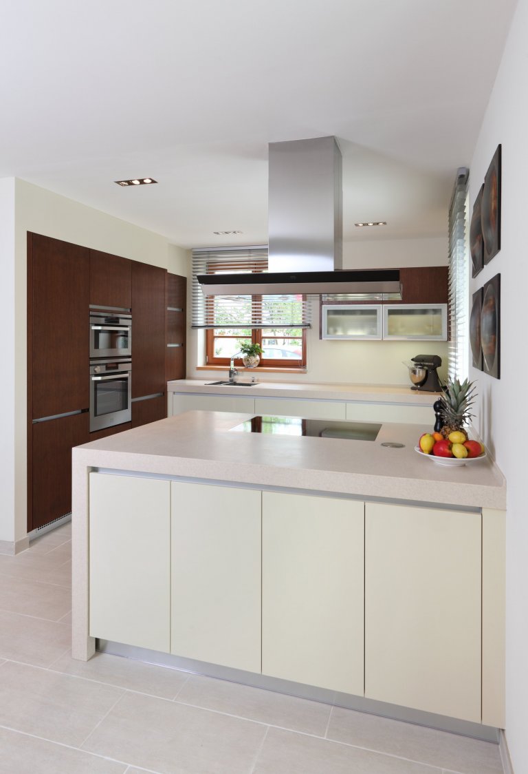 Nenápadný, ale krásně prosvětlený kuchyňský kout. Na první pohled zaujme již osvědčená kombinace tmavého lakovaného dřeva a lamina v barvě slonoviny. Světlá barva vždy dodá na eleganci, zatímco dřevo působí teple a útulně. Všechny úložné prostory mají zapuštěné úchyty, takže nic nevyčnívá ani nenarušuje geometrické linie. Ve stejném duchu jsou do sestavy skříněk a šuplíků zabudovány špičkové vestavné spotřebiče značky AEG. Masivní pracovní deska z umělého kamene vybavení kuchyně krásně doplňuje. Všechny povrchy jsou nalakované do vysokého lesku a prostor v kuchyni tak opticky zvětšují.