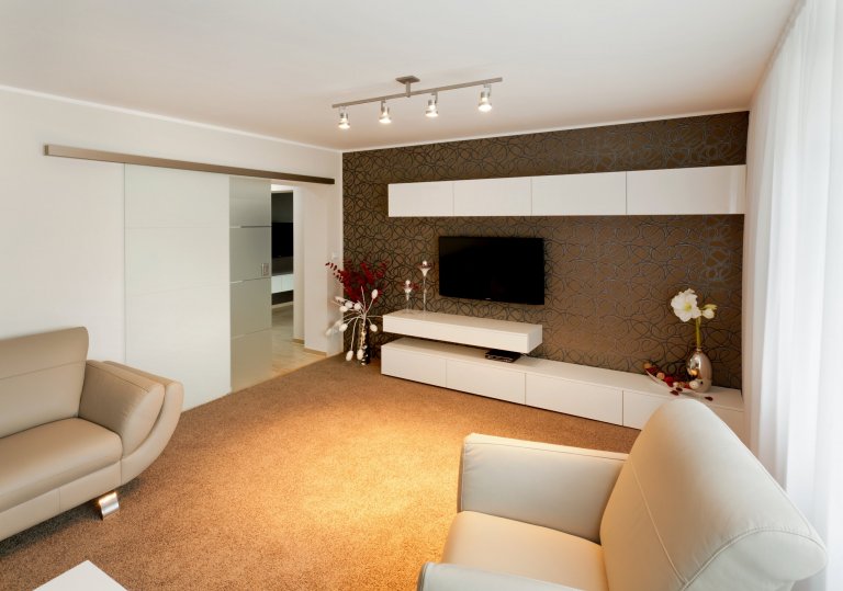 Elegantní kuchyň krásně zasazená do interiéru! Dominuje jí masivní deska z umělého kamene Staron, která barevně ladí s čelní stěnou jídelního prostoru i jídelním stolem. Ze stejného materiálu je pak vyrobena i zástěna nad dřezem a varnou deskou. Pracovní a odkládací plocha je zde opravdu záviděníhodná a ideální pro náročnější vaření. Tomu také odpovídá i velikost úložných prostor – ty najdete nejen podél celé kuchyňské linky, zabírají si pro sebe i celou stěnu na po pravé straně! Všechna dvířka jsou natřena lesklým bílým lakem, který odráží světlo a dodává prostoru vzdušnost.