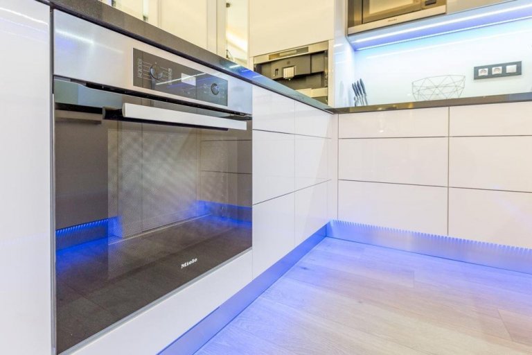 Úložné prostory pak pokračují po celé stěně až ke stropu a nad linkou tvoří dvě osvětlené výklenky - jeden nad dřezem a druhý pod mikrovlnnou troubou. Vysoce lesklý lak se krásně doplňuje s okolním interiérem a odráží světlo z velkých oken naproti. Jídelní stůl pak stylem a designem navazuje na kamennou linku. Parádním prvkem je modré podsvícení, které prostoru dodává jedinečnou atmosféru!