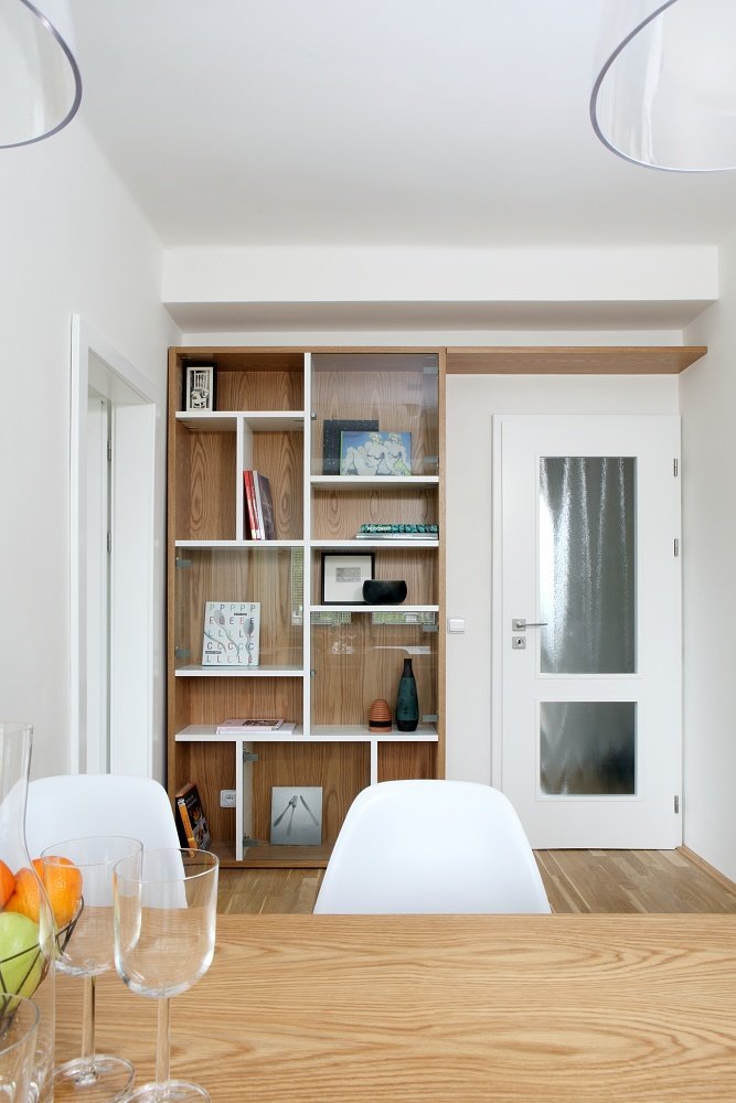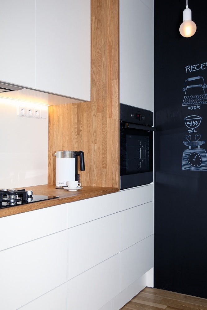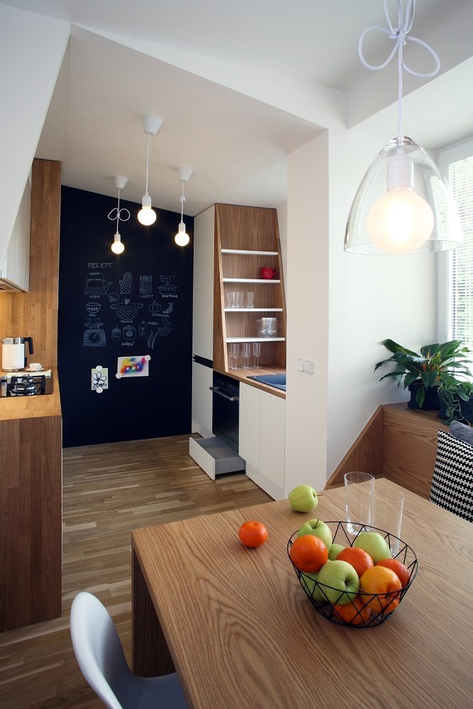 Ze stropu visí jednoduchá „retro“ světla ve stylu klasických žárovek, zatímco do úložných prostor jsou zabudovány vestavné spotřebiče Siemens a Gorenje. Hlavní atrakcí je ale přece jenom velká magnetická tabule, která pokrývá celou kuchyňskou stěnu. Členové domácnosti si tak mohou psát vzkazy nebo zaznamenávat recepty přímo v průběhu vaření!