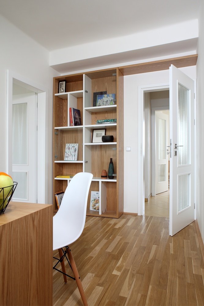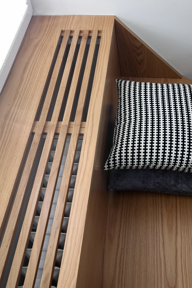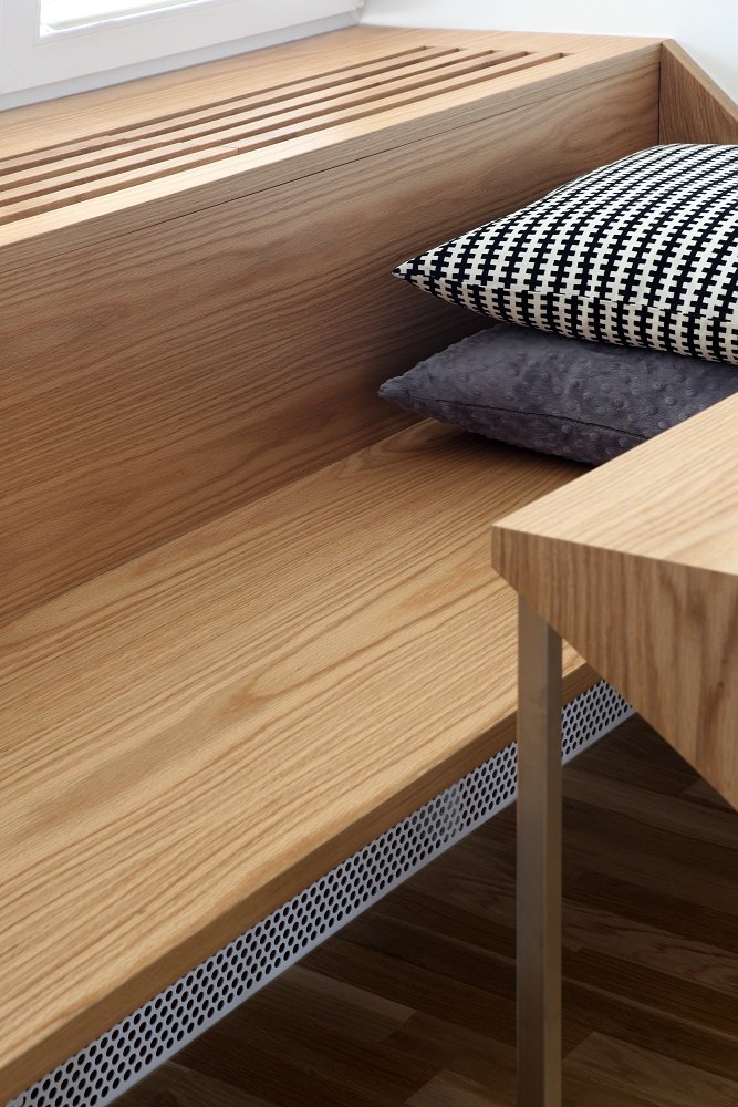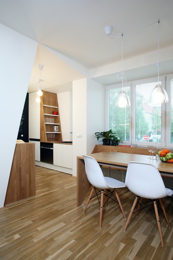 Když není místa nazbyt, je třeba využít všeho, co se dá! Třeba propojit parapet s obkladem topení a vytvořit tak útulné místo na sezení. Popřípadě ho propojit přímo s linkou, aby se na ni vešel i dřez. Tato kuchyně se v omezeném prostoru totiž přímo vyžívá – důmyslná řešení jí jen dodávají ten správný styl! Nejzajímavějším prvkem je využití šikmých ploch, které vizuálně spojují kuchyni s jídelním koutkem. Dřevěné povrchy jsou vyrobené z dubové dýhy, zatímco zbytek tvoří lakované lamino. Pracovní deska je také z dubového dřeva a hladce navazuje na podlahu.