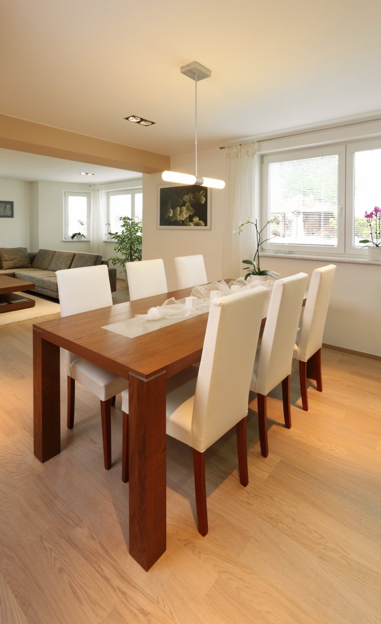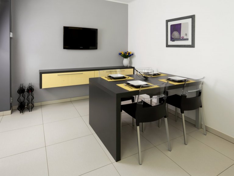 To vše je vyváženo nerezovými prvky, včetně digestoře, rolety a stropního osvětlení. Vizuálně pak kuchyně zasahuje i do prostoru jídelny, kde najdeme černý jídelní stůl i závěsnou skříňku v našem černo-žlutém designu. Celý prostor kuchyně, jídelny a společenského koutku tak krásně splývá v jeden celek.