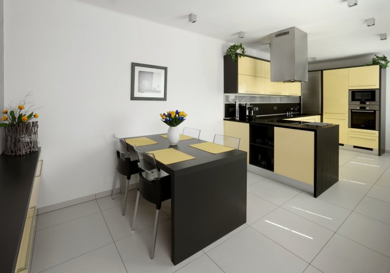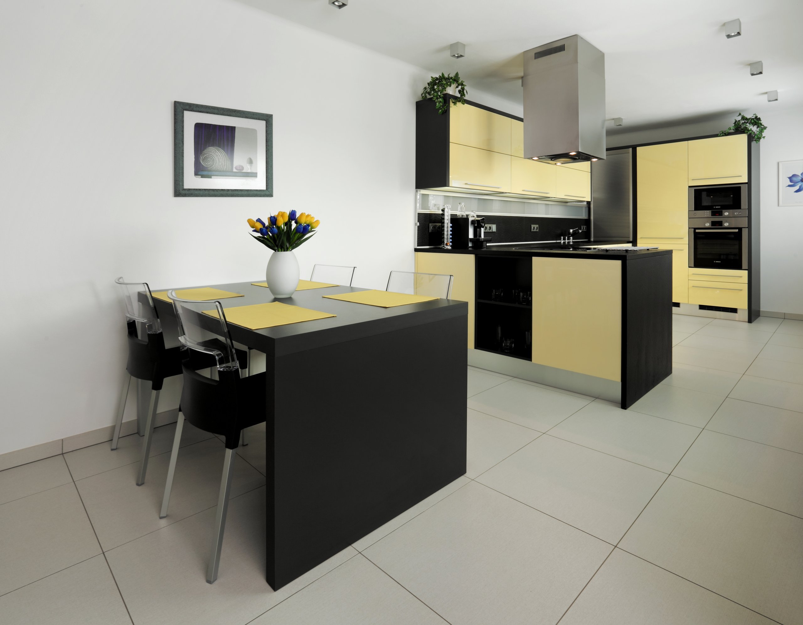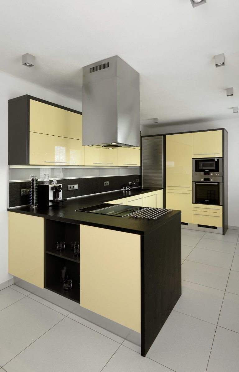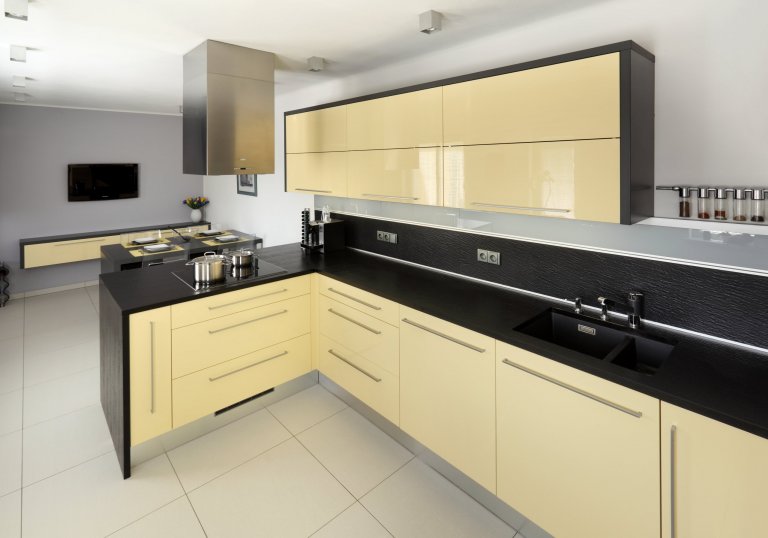 Představujeme vám impozantní moderní kuchyni v neobvyklé barevné kombinaci. Zářivě lesklé skříně ze světle žlutého lamina na první pohled krásně ladí s matně černým povrchem zástěny a kuchyňské desky Technistone. Nepracovali jsme však jen s kontrasty barev. Tmavé povrchy jsou totiž zdobeny jemným reliéfem, který pracovní ploše dodává zajímavou texturu a skvěle doplňuje hladká dvířka úložných prostor. Sestava skříněk a šuplíků vede po celé úctyhodné délce pracovní linky a zaujme asymetrickým rozložením i útlými úchyty. Okrajové linie jsou tak dokonalé, že se jen těžko odhaduje, za kterými dvířky se skrývají špičkové spotřebiče značky Bosh.