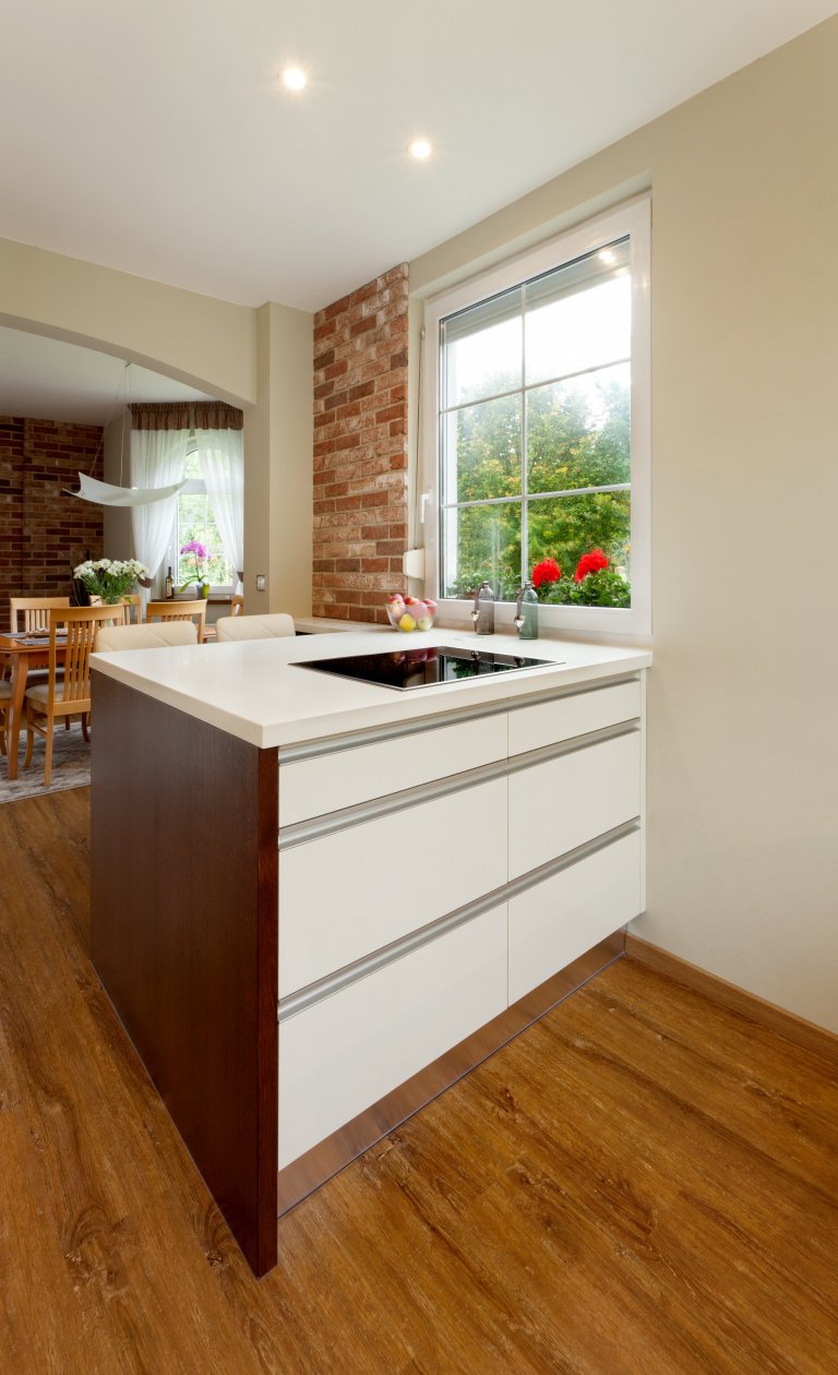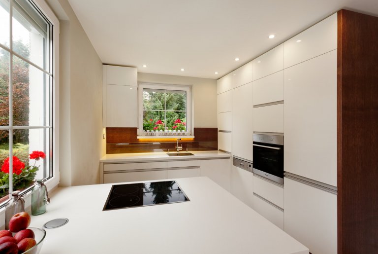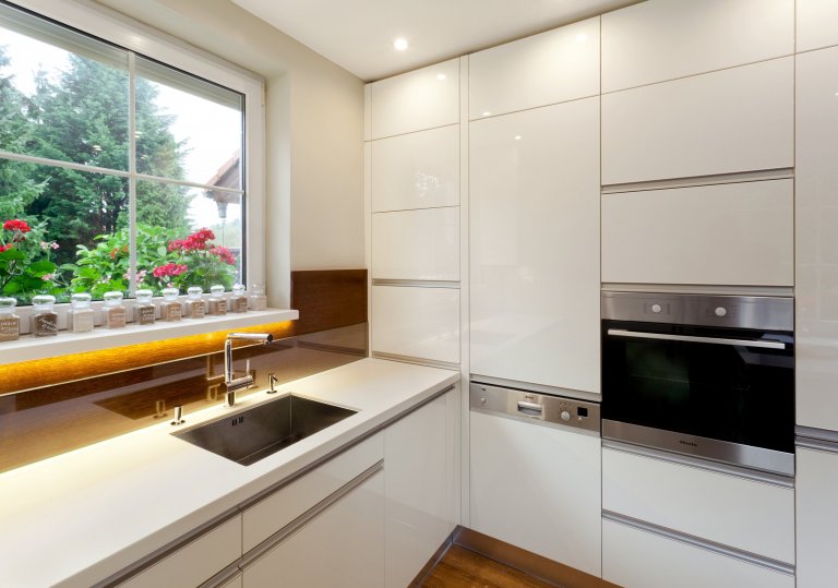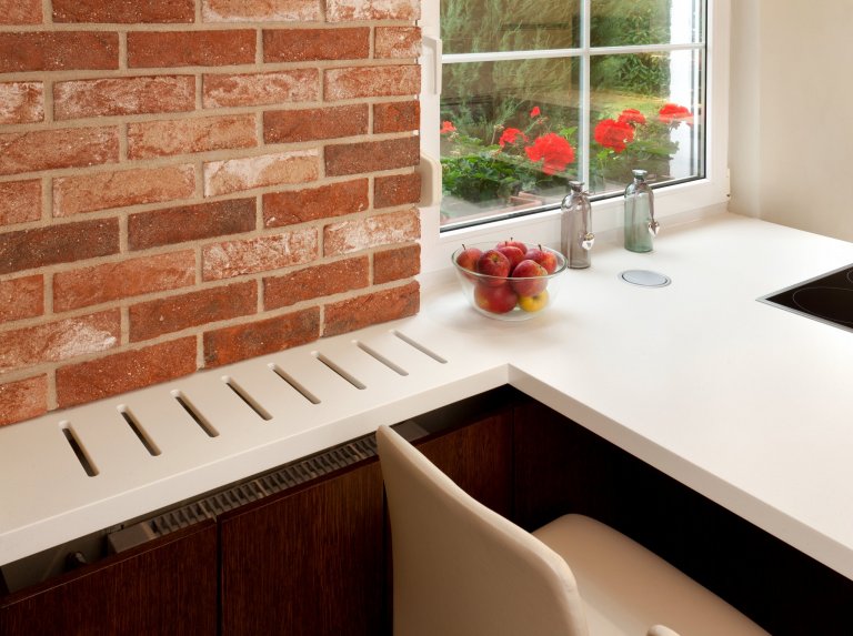 Přípravné prostory jsme hledali, kde se dalo. Například pracovní deska Hanex z umělého kamene je prodloužena o barový pult, který navazuje na parapet vedlejšího okna. Parapet čelního okna našel pro změnu využití jako stojan na koření. Obě okna také hrají důležitou roli v osvětlení kuchyně – lesklé povrchy odrážejí světlo, které přichází z venku, a místnost tak opticky zvětšují. Prostor celkově působí velice útulným a přívětivým dojmem.