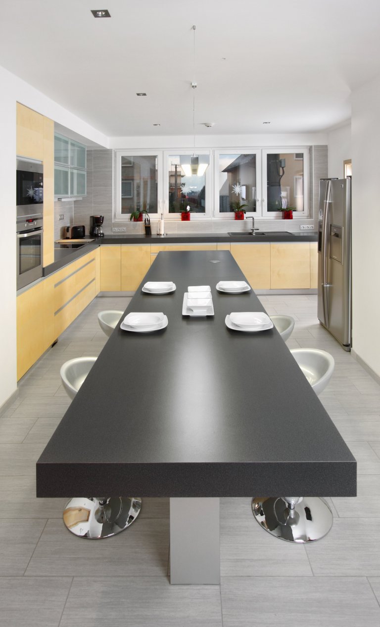 Unikátním prvkem této kuchyně je modifikovaný ostrovní pult, který z jedné strany skrývá dodatečné šuplíky a z druhé se maskuje jako jídelní stůl. Je úzký, aby zachoval dostatek průchozího prostoru a nepřekážel u vstupních dveří. Zároveň vyplňuje prostor mezi úložnými prostory a stává se tak impozantním středobodem celé kuchyně.