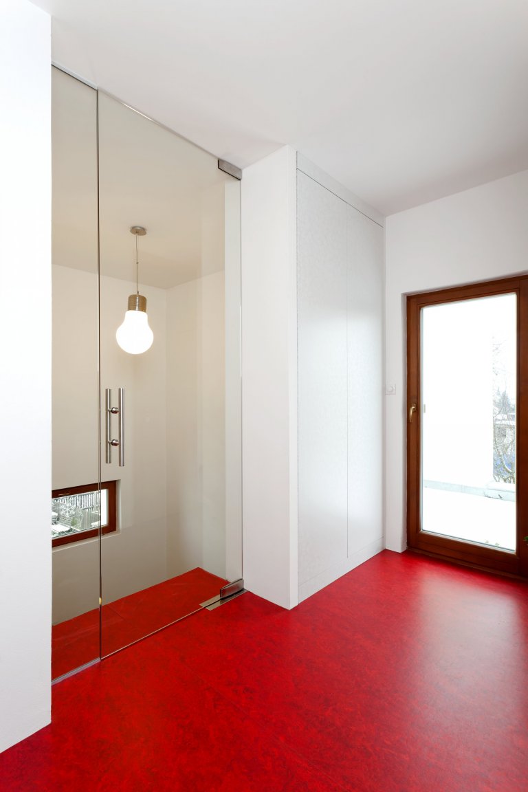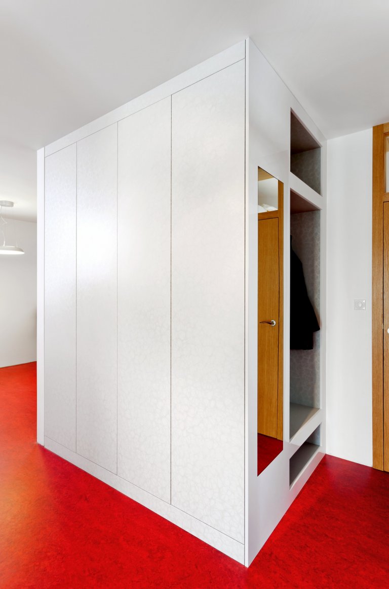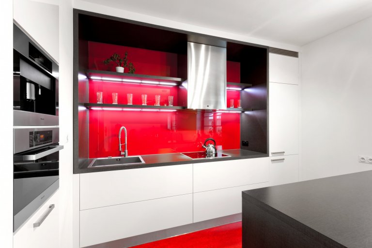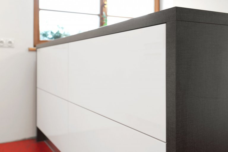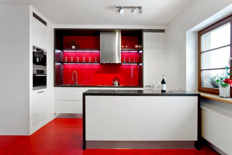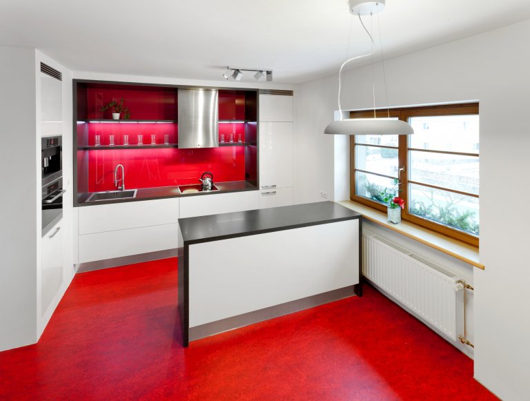 Představujeme vám kuchyň jednoduchých tvarů a dramatických kontrastů. Bílé plochy, které tvoří robustní základ celé kuchyně, lemuje strukturovaný tmavý povrch, zatímco podlaha a pracovní okénko září jasně červenou barvou. Ta prostoru na první pohled dodává osobitou jiskru a opticky jej zatepluje. Dvířka úložných skříní jsou vyvedena ve vysokém lesku a skvěle tak ladí s matnějším povrchem postformingové pracovní desky, která zároveň slouží jako barový či odkládací pult.