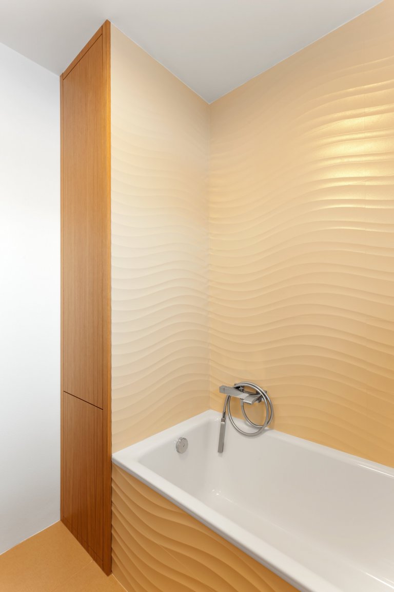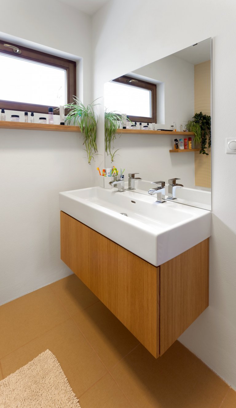 Vzhledem k tomu, že jsou zóny na vaření a mytí nádobí umístěné ve výřezu, bylo pro nás důležité zajistit kvalitní osvětlení pracovní plochy. Na spodní stranu poliček jsme tudíž rozmístili kalená LED světla. Aby se mělo světlo od čeho odrážet, opatřili jsme navíc zadní plochu okénka skleněnou zástěnou. Celkový elegantní vzhled kuchyně pak podtrhují vestavné spotřebiče značky Miele, které krásně zapadají do jednoduchých linií interiéru.