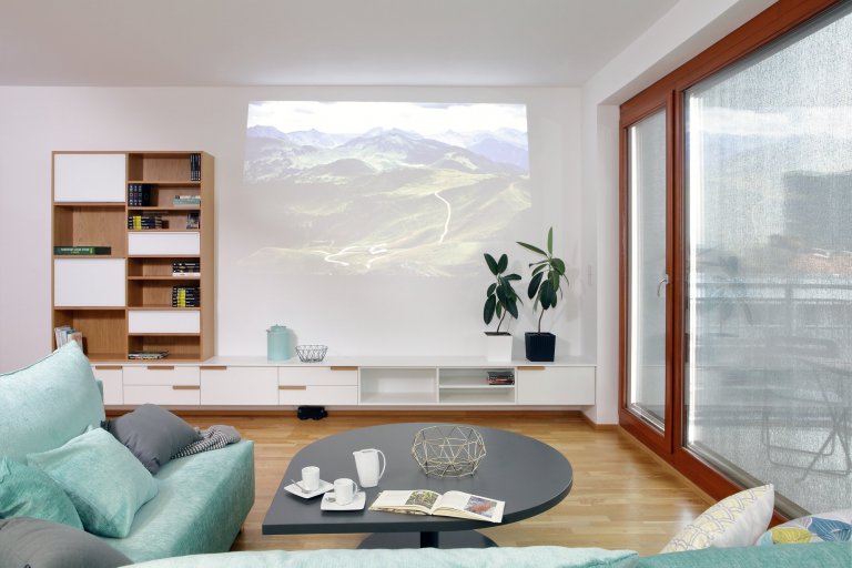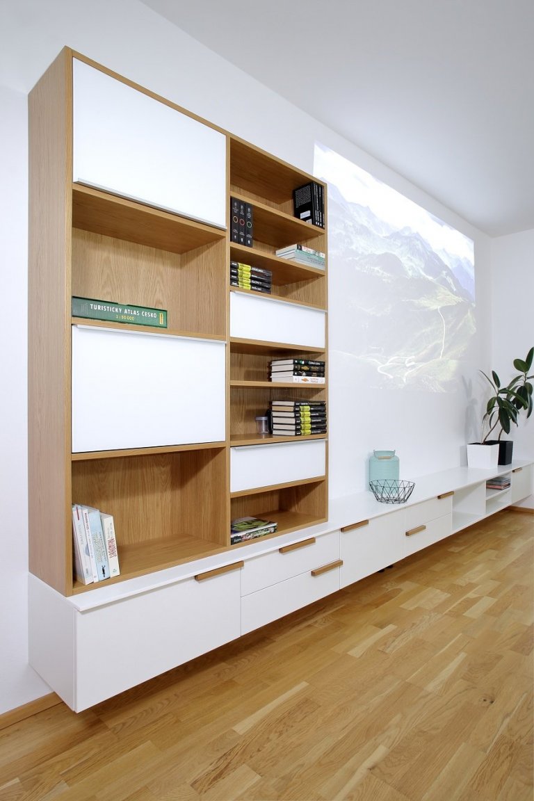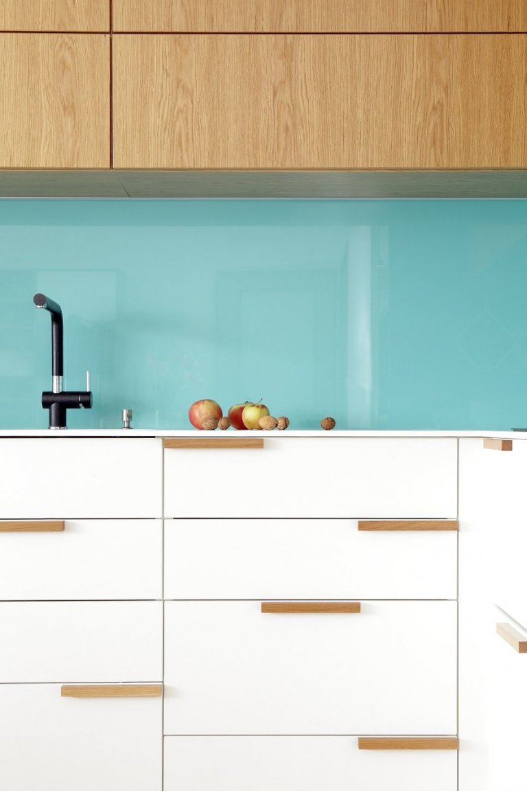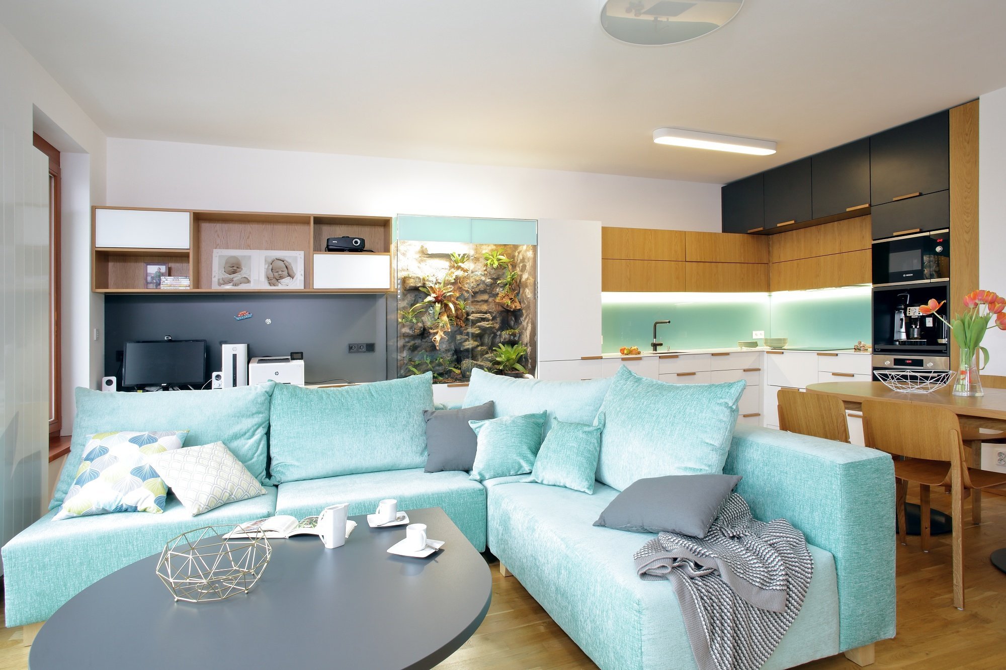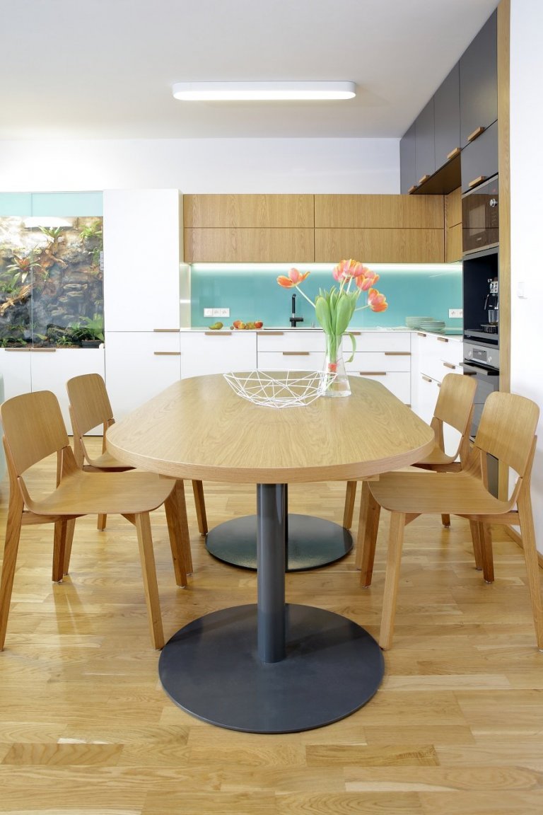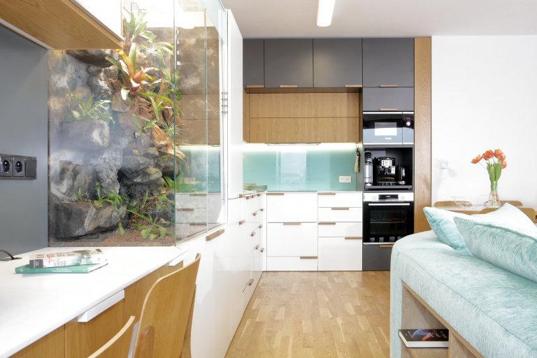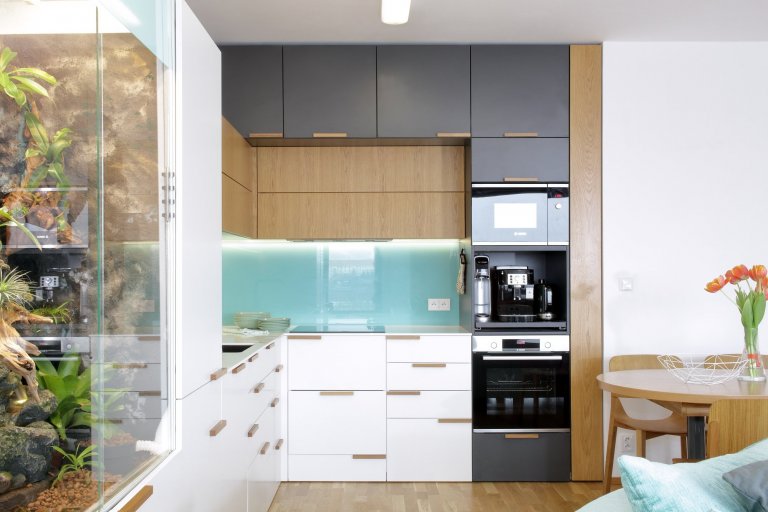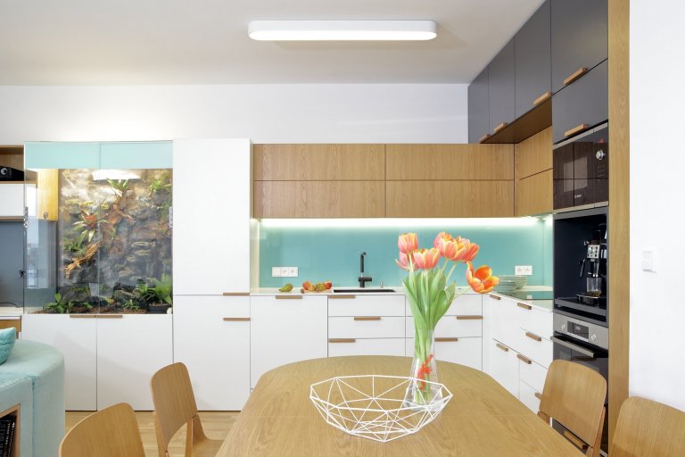 Náhodně rozmístěné úchytky a sada skříní nad kuchyňskou linkou jsou vyrobeny ze světlého dubového dřeva a skvěle doplňují jídelní stůl s oblíbenými židlemi TON. Ostatní dvířka z bílého a antracitového lamina také do interiéru skvěle zapadají. Kuchyni pak neskutečně oživuje modré „okénko“ nad dřezem – díky zástěně z kaleného skla je totiž opticky sehrané s floráriem v obývacím pokoji! Prostě super soužití člověka s přírodou!
