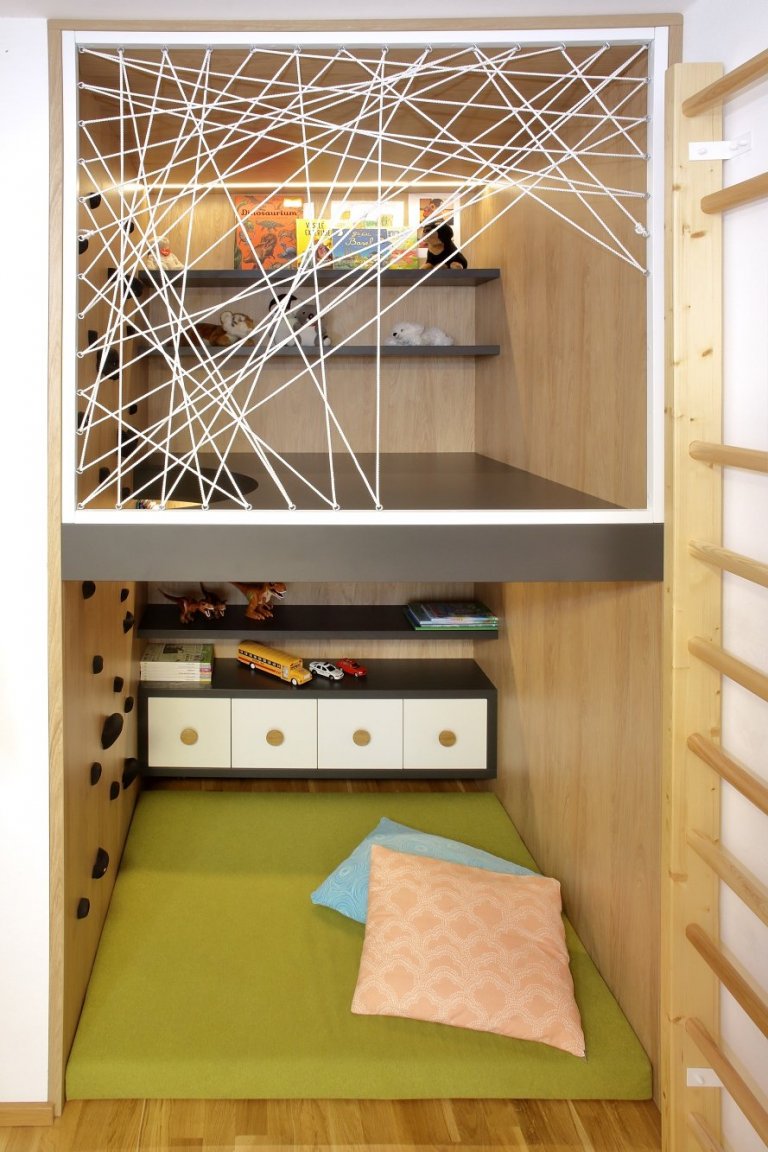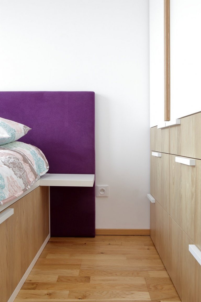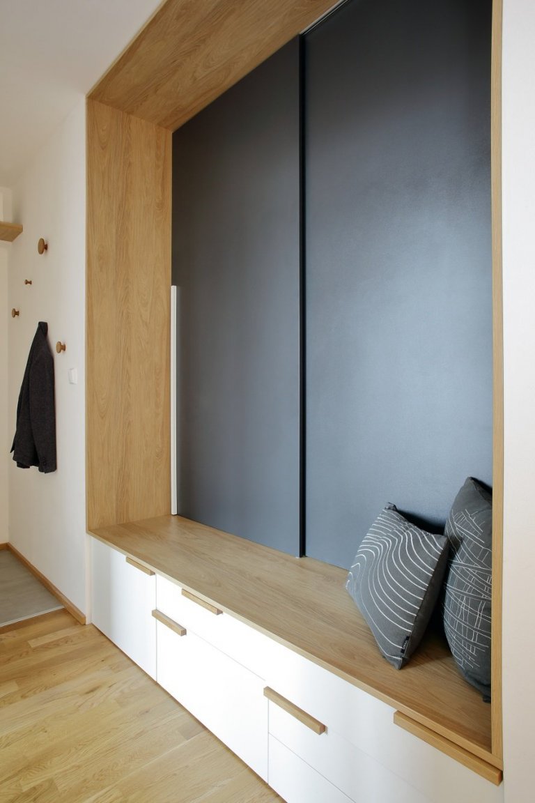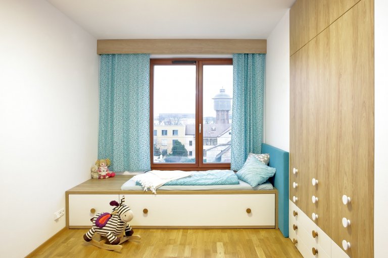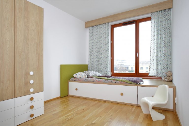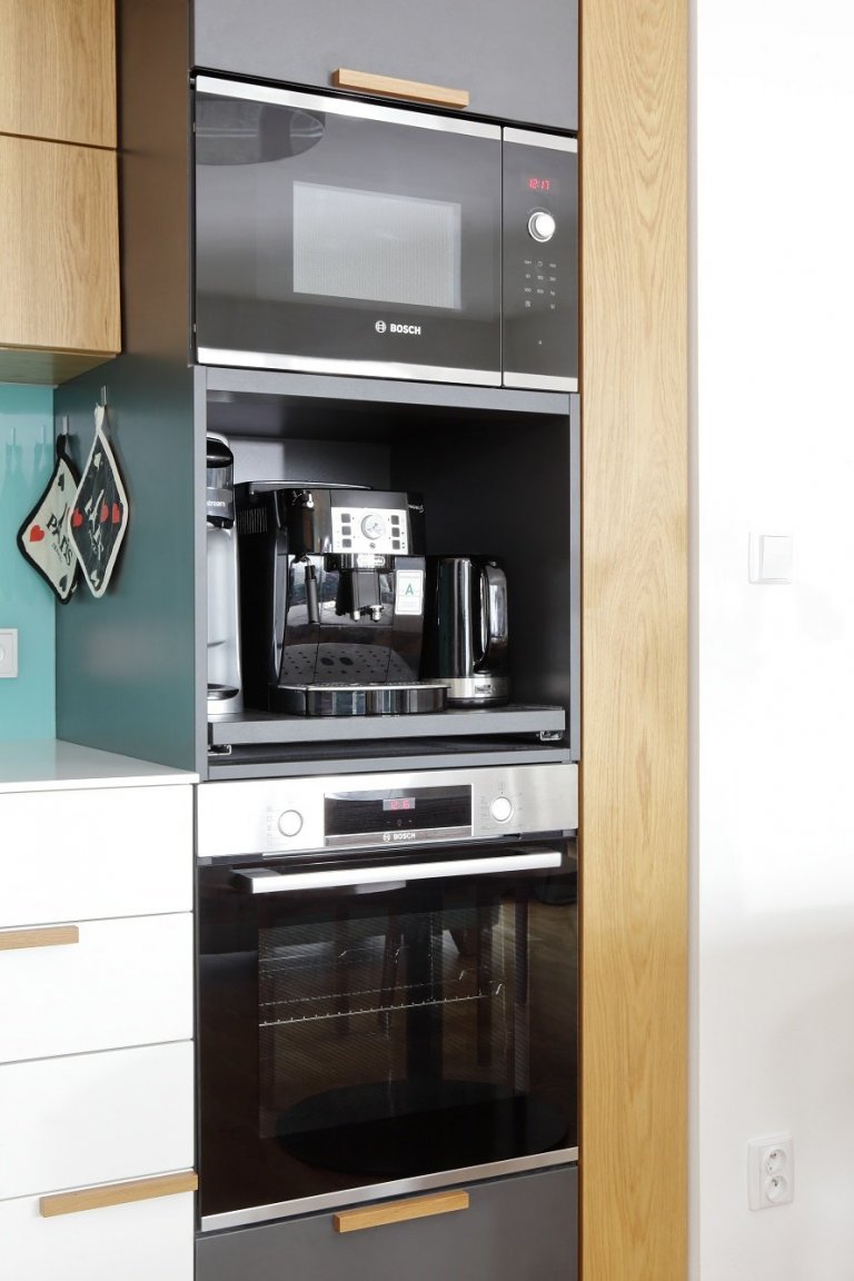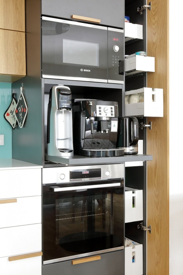 Tam, kde není moc místa, se obvykle najde spousta nápadů a tento kuchyňský koutek je toho skvělým příkladem! Pracovní linka z umělého kamene Staron kopíruje roh místnosti tak, aby poskytla dostatek místa pro indukční desku, dřez a přípravnou plochu. Prostor kolem ní je pak dokonale vyplněn skříňkami, šuplíky a vestavnými spotřebiči Bosch – ani centimetr nepřijde nazmar. Všimněte si třeba důmyslného řešení úzké skříně, která zcela lemuje pravou stranu kuchyně. Na minimálním prostoru tu vznikl šikovný úložný prostor, a to od podlahy až ke stropu!