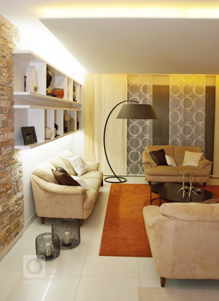 Tento obývací pokoj prošel redesignem, tedy část zařízení zůstala původní a část byla nově vyrobena namíru. Celkově byl interier barevně a materiálově sladěn s původním provedením, doplněn vhodnými textiliemi, suvenýry z cest majitelů a dalšími dekoracemi v ethno stylu.