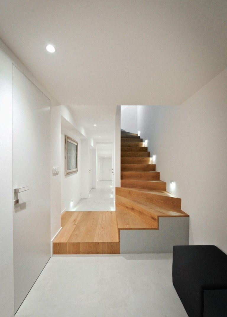 Samotná atmosféra interiéru domu částečně vyplynula ze společné diskuze a z požadavků na využití prostorů. Klienti preferovali přírodní povrchy, především dřevěnou olejovanou podlahu. Dub a jeho modifikace, ať už v podobě podlahy, obkladu nebo použití na nábytku, se line celým domem a propůjčuje prostoru teplou přirozenou barvu. Prostory náročnější na provoz, jako je zádveří, komunikační chodby, garáž a zimní šatna mají podlahu ze světlešedé betonové stěrky, která koresponduje s architektonickým směrem funkcionalismu. Koupelny a toalety již byly obloženy přírodním travertinem, pro sjednocení s interiérem domu se i zde zvolily pro doplnění šedé, již kontrastnější stěrky.