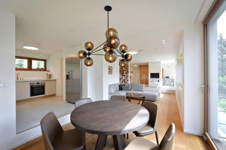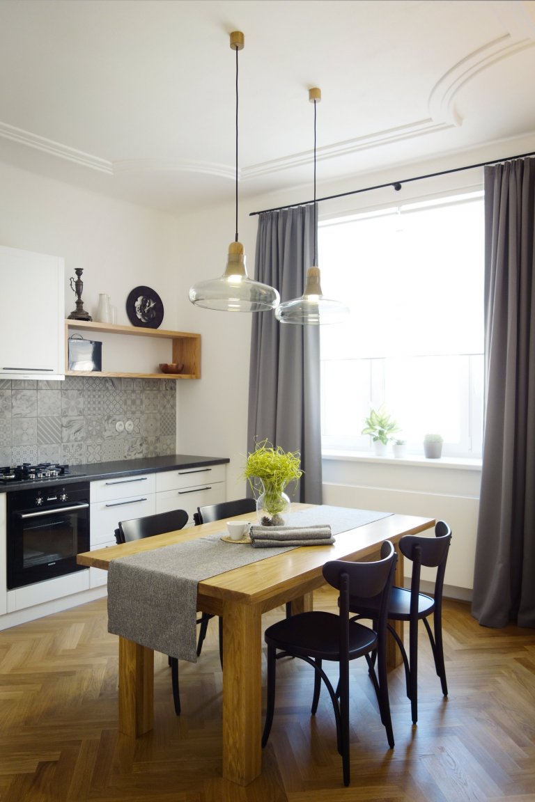 Byt se nachází ve starém bytovém domě na hlavní pěší zóně v centru Jičína. Původně zde byly kanceláře, a tak dispozice vyžadovala velké zásahy jak stavební, tak instalační. Bylo nutné odstranit průchozí místnosti, vybudovat kuchyň i hygienické zázemí. Přáním klienta byl interiér v původním duchu domu, který je z první republiky. Na dlažby a obklady byl použit italský travertin, veškeré dřevěné podlahy a dřevěný nábytek je z přírodního olejovaného dubu. Do bytu se vrátila i kachlová kamna.