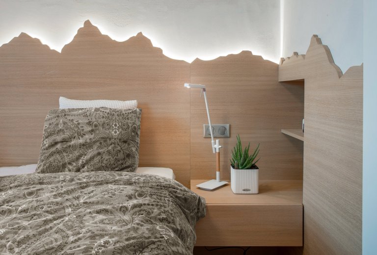 Rozhodli jsme se opustit konvenci pravoúhlého členění dispozice. Chtěli jsme již při vstupu do bytu vytvořit vizuální propojení s exteriérem, tedy hlavní průhledové osy směrem od vstupních dveří přes obývací prostor na terasu. Vznikla tak postupně se rozšiřující chodba rozlévající se do hlavního obytného prostoru, která je celá obložena dřevem – na podlaze, na stěnách i na stropě. V rámci dřevěného obkladu jsou skryty dveře do místností a jsou zde umístěny niky pro ukládání upomínkových předmětů z cest.