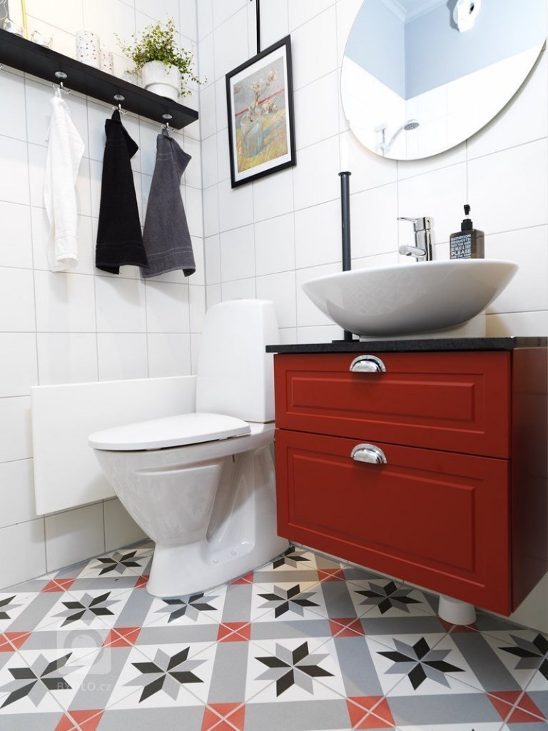 WC s bílými obklady a dlažbou s klasickým historickým vzorem.