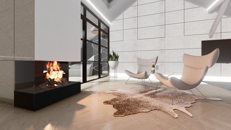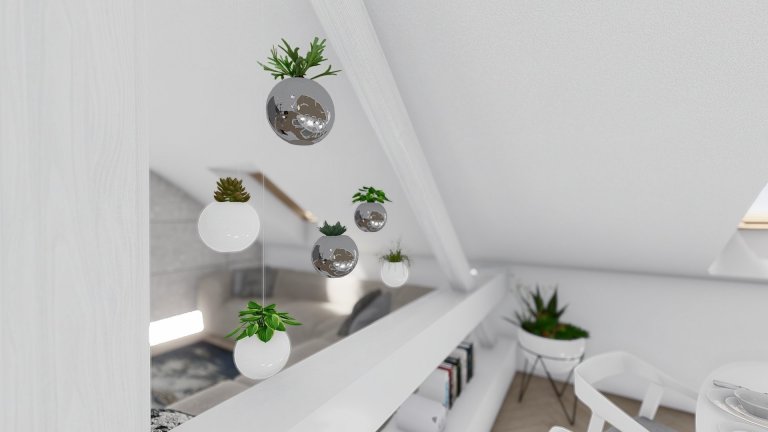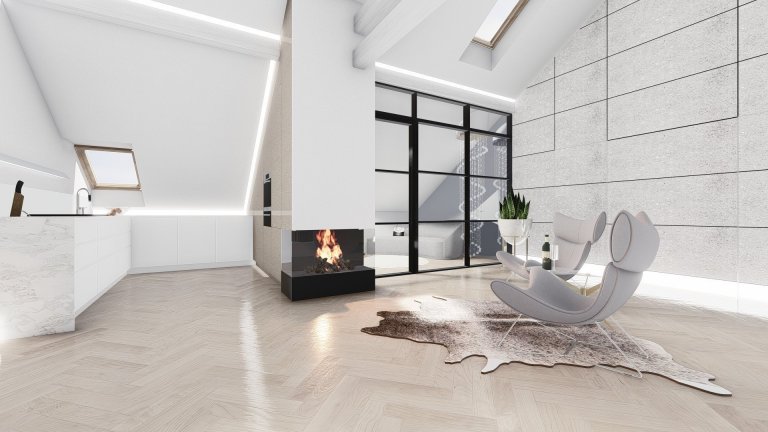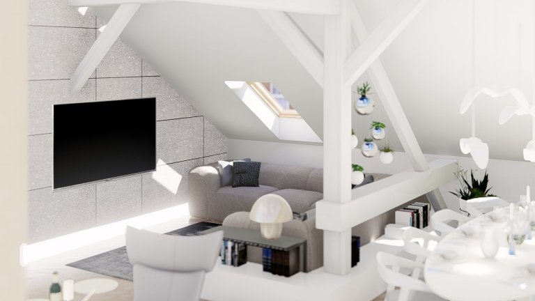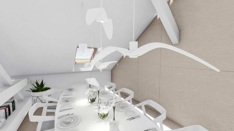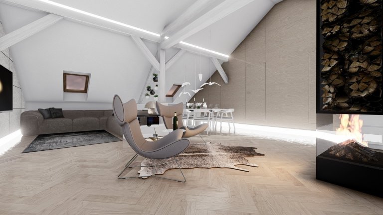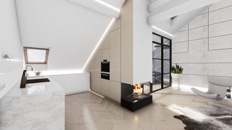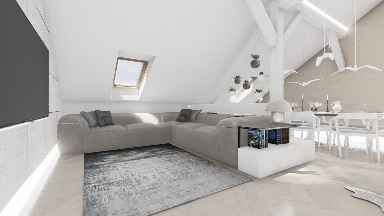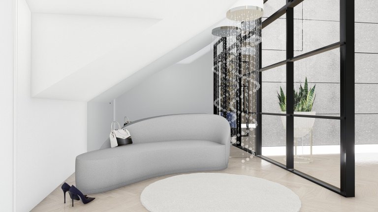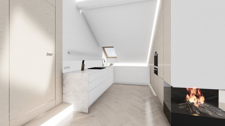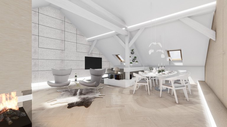 Vytvořit elegantní prostor v podkroví městského domu, kde jsou typické trámy a atypické místnosti se skosenými stropy, byl opak stylu, který je klienty zpravidla pro půdní interiéry žádaný. Avšak zde je ukázka, že je to možné. Světlé barvy dýhy kombinované s bílou a šedou barvou příjemně zatepluje nově vystavěný krb a harmonii, lehkost a volnost zde znázorňují závěsná svítidla ve tvaru ptáků nebo metalické baňky s rostlinami. Rozšířené bylo také zádveří, protože to v současném bytě chybí. Abychom opticky zachovali velikost celého prostoru je zádveří odděleno skleněným předělem s ocelovou konstrukcí.