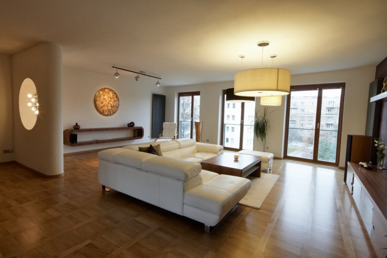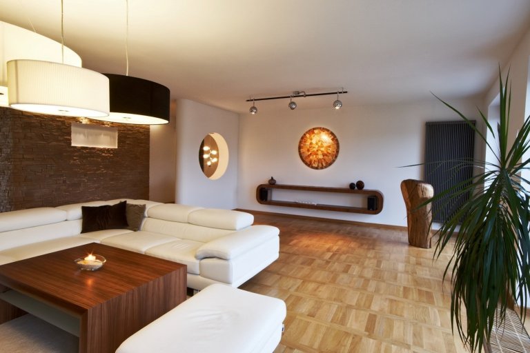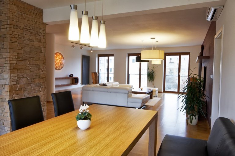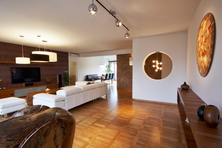 Za jeden z nejzdařilejších interiérů považujeme tento byt na Praze 6. Na přání klienta jsme jej pojali v minimalistickém stylu a hlavní roli zde sehrál dřevěný obraz Martina Patřičného, který byl vyrobený přímo pro náš interiér. Dalšími vychytávkami byl nábytek s oblými rohy a dělící příčka s kruhem.