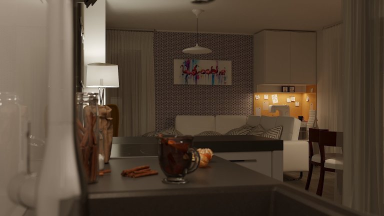 Pracovní koutek i obývací stěna byly namodelovány přesně dle náčrtků, které jsem od majitelky obdržela. Zkoušeli jsme ještě různé barevné kombinace, nakonec si klientka vybrala tu, která jí nejvíce padla do oka. Časem dojde ještě k výměně jídelního stolu. Kromě něj, sedací soupravy a konferenčního stolku bude všechen nábytek řešen na míru. Nicméně už teď se těšíme na realizaci dle této vizualizace.