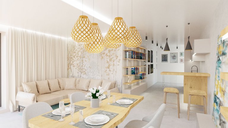 Zvolené barvy jsou světlé, tlumené přírodní odstíny pískové a béžové v teplých tónech, které jsou lidskému oku příjemné. V obývacím pokoji na stěně je tapeta s rostlinnými motivy.