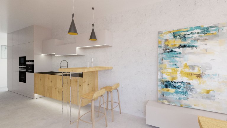 Podlaha v celém bytě je navržena betonová epoxidová stěrka, 2 x lakovaná, která odolá psím drápkům.