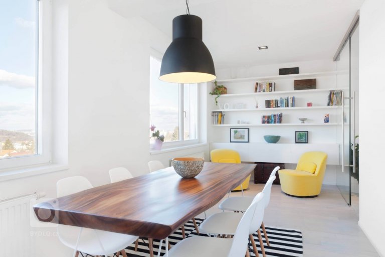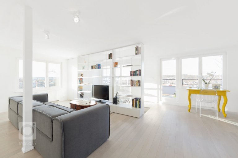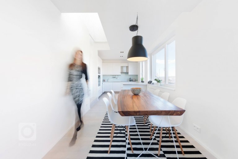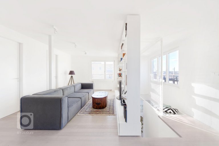 Komplexní rekonstrukce mezonetového bytu na Malvazinkách, jejíž součástí bylo nové dispoziční řešení a kompletní renovace rozvodů a porvchů včetně vybavení bytu. Dominantou je bíla barva, která utváří neutrální pozadí pro jednotlivé prvky a atypické řešení. Předsíň je oddělena skleněnou příčkou, čímž se prostor jídelny vizuelně zvětšil, stejný princip jsme použili také v ložnici při propojení koupelny s hlavím prostorem. Důležitým prvkem je apliakce sítě nad schodištěm, která funguje jako hrací koutek pro děti s možností komunikace z patra na patro.