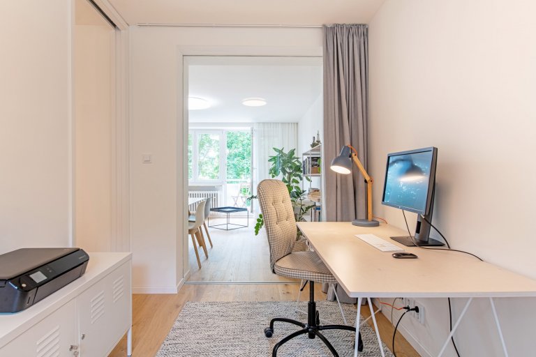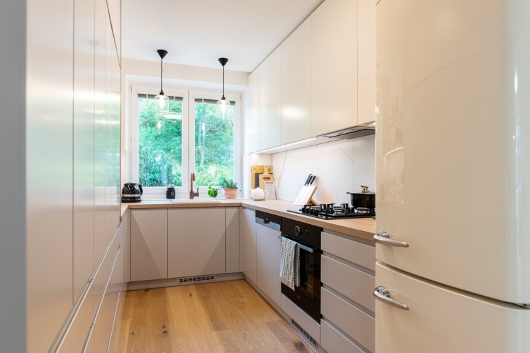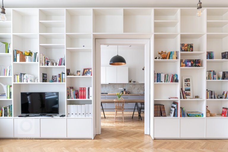 Nejdříve jsme zcela zásadně propojili prostor kuchyně a obytného prostoru včetně chodby a přidali i skleněnou stěnu mezi pracovnou a obytným prostorem. Vytvořil se optický velmi vzdušný a prosvětlený prostor napříč celému bytu. Vytvořením různých nik a šatny v ložnici jsme se zbavili jakéhokoliv velkého nábytku. Zajímavostí kuchyně je velmi praktická skříňka s posuvnými dvířky na uložení veškerých malých spotřebičů.