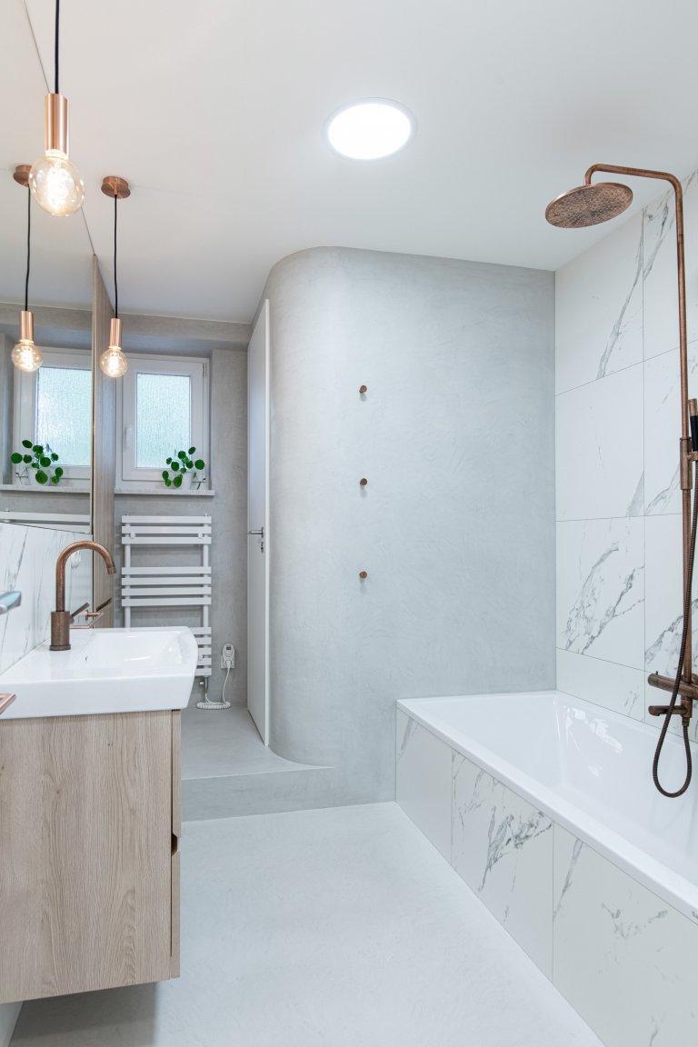 Koupelna s odděleným WC, sníženou vanou se sprchou a zabudovanou pračkou se sušičkou opět působí prostorně. Nadčasový design v obkladu v dekoru mramoru je doplněn jemnou betonovou stěrkou. A jak jsme si poradili s chromem?
