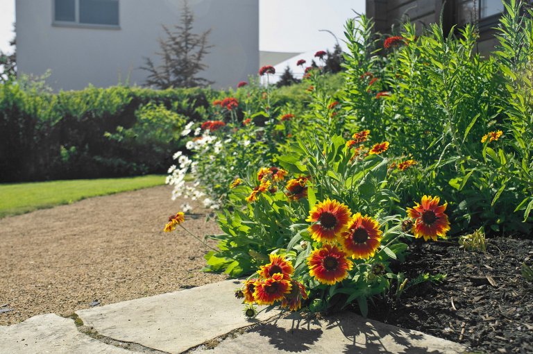 Původní nekvalitní převážně jehličnatá výsadba byla nahrazena a doplněna sortimentem kvetoucích trvalek a keřů. Na zahradu bylo přidáno místo pro posezení a malé jezírko s tekoucí vodou, závlahový systém. Vysoké kosterní jehličnany byly ponechány, podrost byl doplněn o poléhavé a kvetoucí trvalky.
