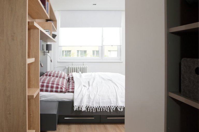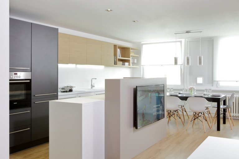 Díky připojení dvou místností přes nosnou zeď se celá dispozice otevřela a bylo možné vybudovat velkou vstupní chodbu, kuchyň propojenou s obývacím pokojem, ložnici rodičů s vlastní koupelnou, dva dětské pokojíky a ještě jednu dětskou koupelnu. Vznikla i z chodby přístupná technická místnost s pračkou, sušičkou a veškerým zázemím pro praní, žehlení a skladování prádla.