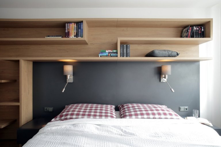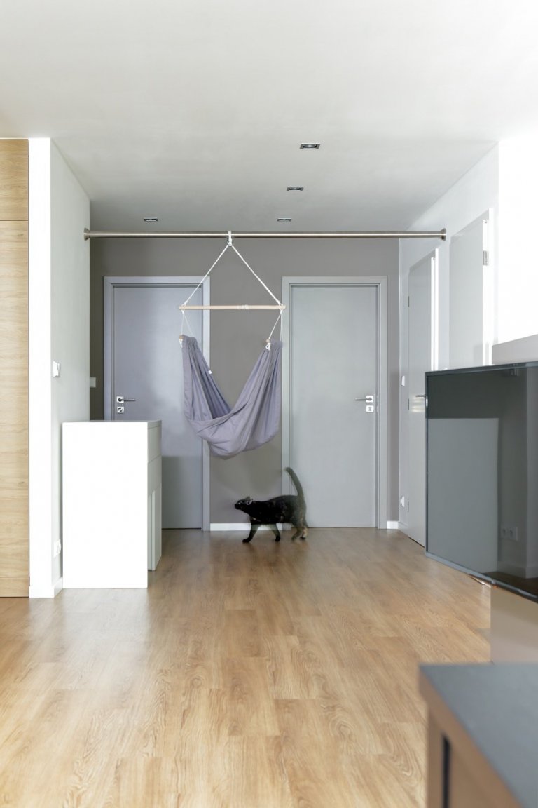 Interiér panelového bytu s takto velkorysou dispozicí se podařilo vytvořit propojením dvou sousedících bytových jednotek. Majiteli bytu je mladý pár s jedním malým dítětem a s výhledem na další přírůstek. Z této situace a z faktu, že majitelé jsou vášniví chovatelé dvou koček, vycházelo i zadání projektu. Z neudržovaného a 30 let netknutého bytu měl vzniknout moderní a prostorný interiér s dvěma dětskými pokojíky a zázemím pro kočky.