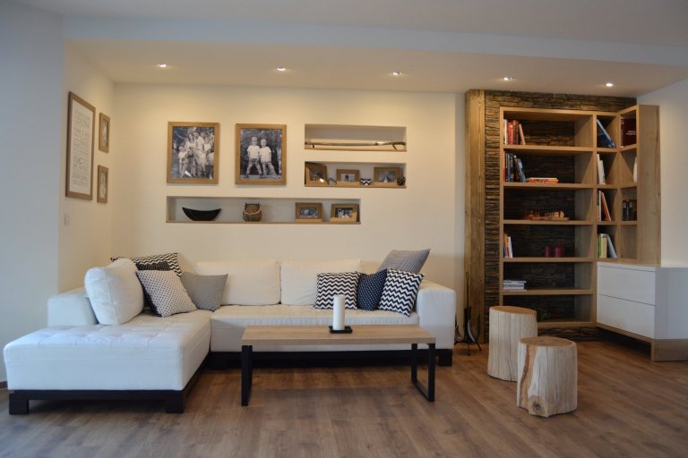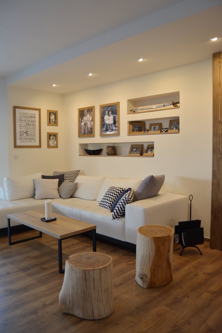 Obývací pokoj je použitím stejných materiálů opticky propojen s navazující kuchyní. Proběhla zde výměna podlahové krytiny, vznikly podhledy pro bodové osvětlení, nové předsazené stěny umožnily vytvořit niky (na televizor a jako police nad sedačkou). Veškerý nábytek byl navrhnut na míru vč. vyzděné knihovny, zakomponovaly se některé staré předměty (housle apod.) v kombinaci s dekoracemi novými.