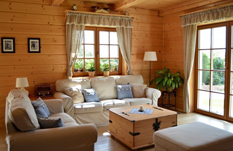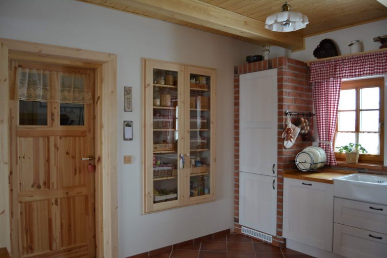 Prostorná rustikální kuchyně s moderními spotřebiči, doplněna památečnými kousky (formy, mlýnky, ošatky atd.) a cihlovým obkladem pro navození požadované útulné atmosféry v chalupářském stylu. Oddělení jídelní části barem se dvěma židličkami, velký stůl vzniklý z renovované podnože pracovního ponku a nové masivní desky korespondující s trámy a dřevěným obkladem stěn a stropu. Cílem bylo propojit i opticky oddělenou obývací část směřovanou pohledem do zahrady v jeden příjemný a harmonický celek vzbuzující dojem chalupy.