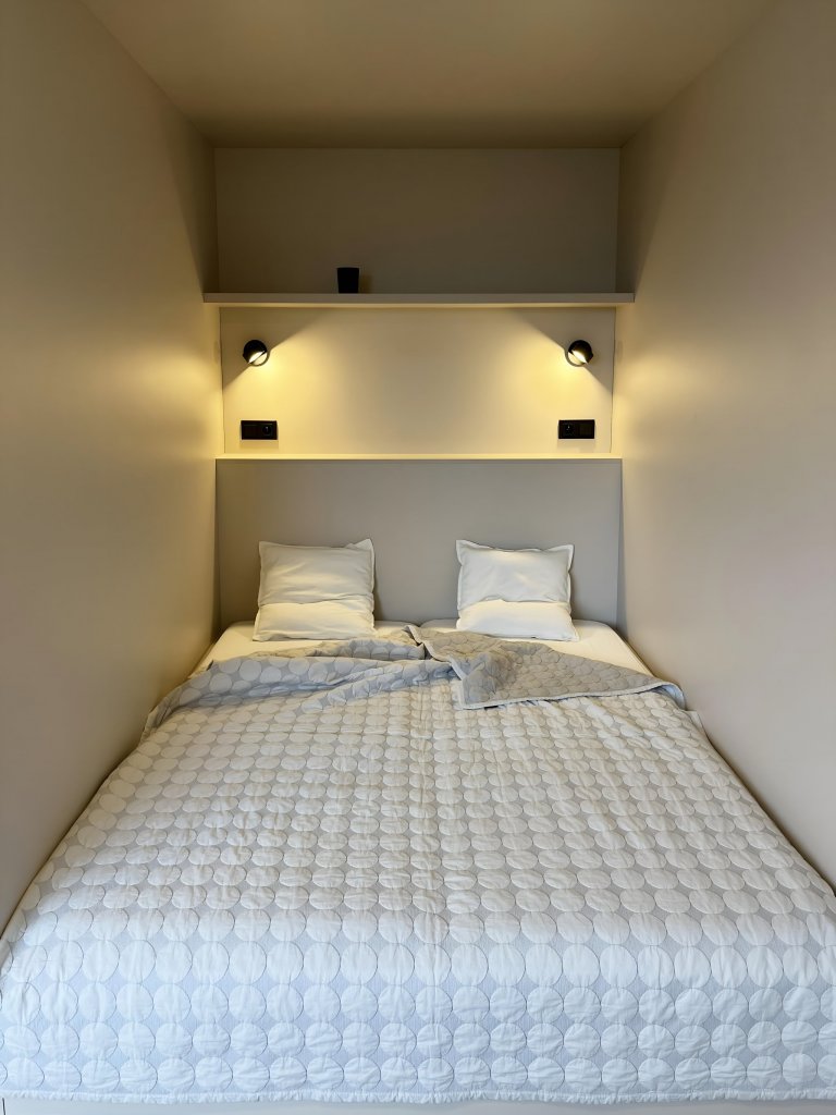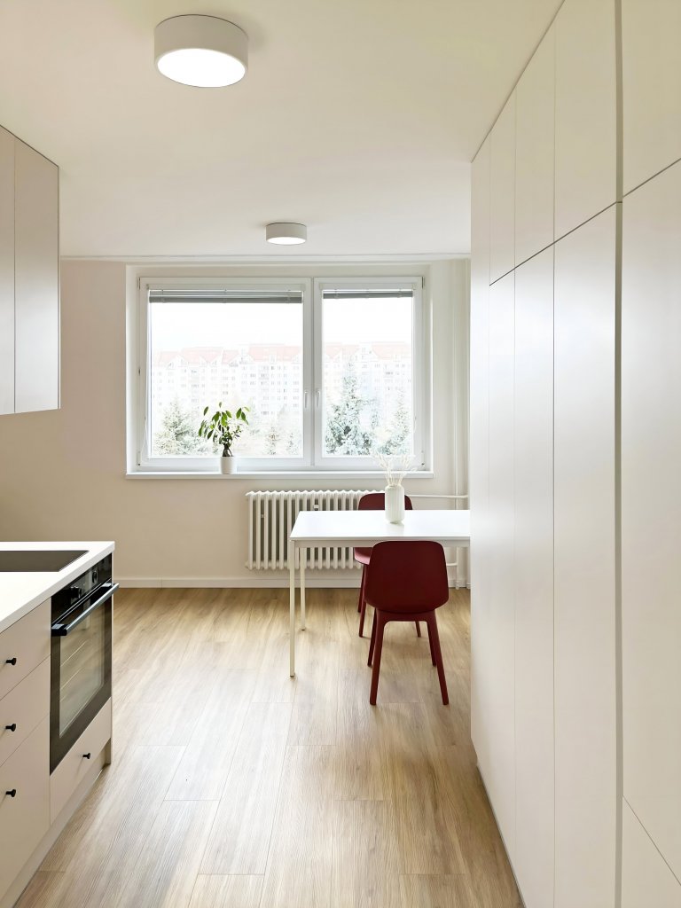 Částečným rozdělením hlavního obytného prostoru příčkou vznikl blok s kuchyňským a spacím koutem. V rámci konstrukce postele jsou skryty rozvody pro kuchyň, takže nebude nutné větší snížení podhledu nebo přizdívání v jiných částech bytu. Nábytek v prostoru před oknem je řešen volně tak, aby bylo možné jej přemisťovat podle potřeb uživatelky. Samozřejmostí také bylo do bytu dostat maximum úložných prostor.