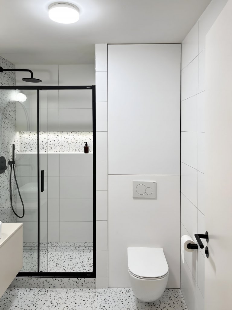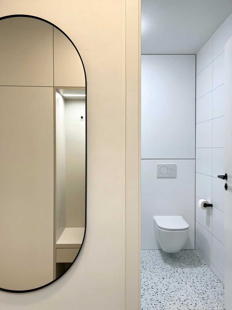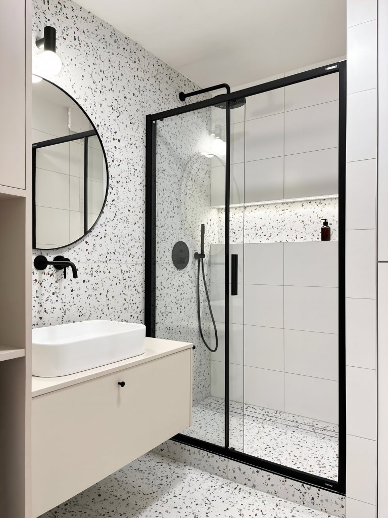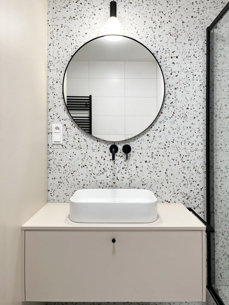 V garsonce bydlí mladá slečna, což se odrazilo na celkovém ladění interiéru. V koupelně i v kuchyni je použit obklad s dekorem hravého terazza, ke kterému je barevně laděn ostatní nábytek. Vzhledem k velikosti bytu jsou použity především světlé odstíny, které kontrastují s černým kováním, bateriemi a svítidly. Byt bude v budoucnu pravděpodobně určen k pronájmu, proto byl jeho design navržen i s ohledem na to, aby zaujal případné zájemce.
