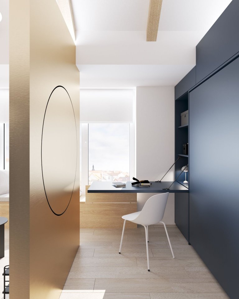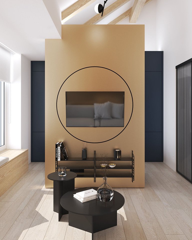 Skloubení všech těchto funkcí tak, aby se vzájemně provozně nerušily, je vyřešeno pomocí vysokých zlatých příček, které prostor rozdělují na jednotlivé zóny. Jejich uspořádání zohledňuje celkové provozní vazby bytu.