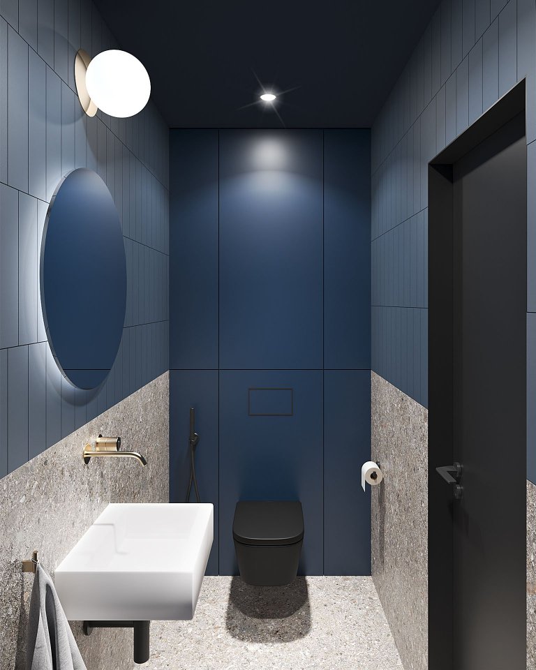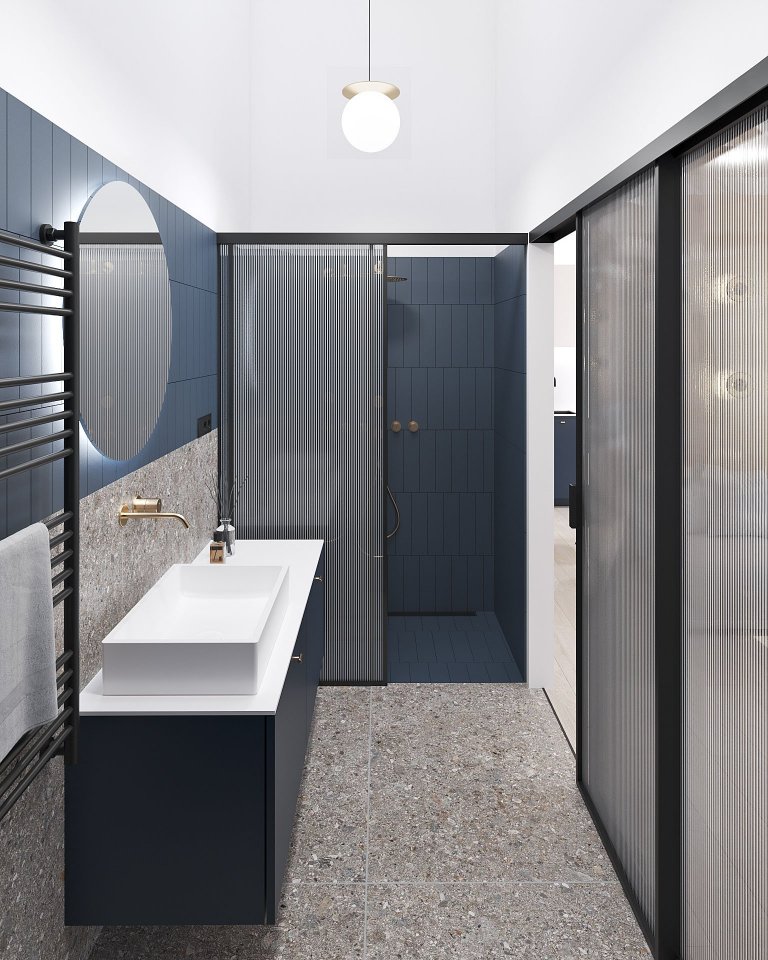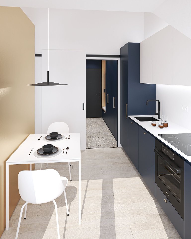 Výběru materiálu dominuje tmavě modrá barva, která se objevuje na nábytku, keramických obkladech i výmalbě stěn a stropů. V kontrastu k ní byl na povrchovou úpravu příček zvolen zlatý vysokotlaký laminát, který spolu s výběrem svítidel bytu dodává bytu lehký futuristický nádech.