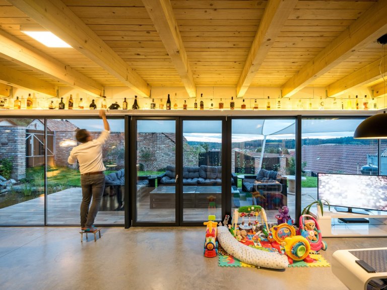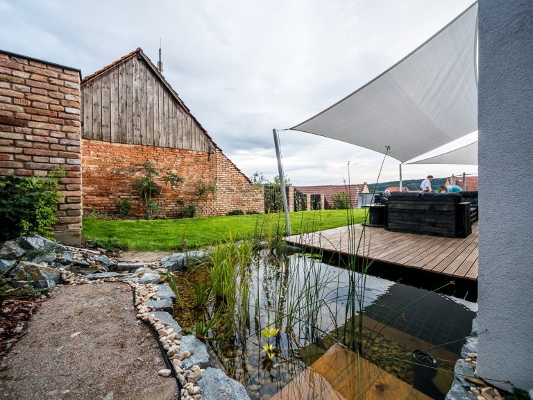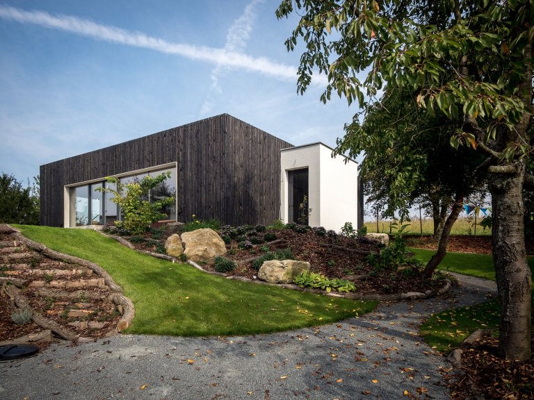 Luxusní ZENHOME u Brna s obřím rohovým prosklením se těší krásným výhledům do okolí. Původně nenápadný pozemek ve staré zástavbě bylo třeba navýšit (posloužila suť z původních zchátralých objektů), dům tak stojí uvnitř dvora, okolní zástavbu doplňuje nový objekt s přídavnými fukncemi (letní kuchyň, sklad, garáž), zahrada kolem domu tak má dostatek soukromí a samotný ZEN HOME je pro pohledy z okolních ulic skrytý.