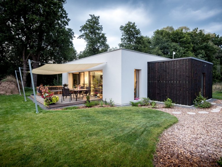 Modifikovaný typový dům ZENHOME u Pardubic stojí na krásném místě hned u potoka. Velkou prosklenou stěnou se otevírá do zahrady a sluncem, které zapadá za nedalekými borovicemi. Dům je doplněn přístavbou z černých nesámovaných prken, která hraje důležitou roli při pohledu na dům z ulice. Tento ZEN HOME považujeme v podstatě za referenční, nikde nic navíc! Interiér je dle našeho návrhu, doladěný svými majiteli.